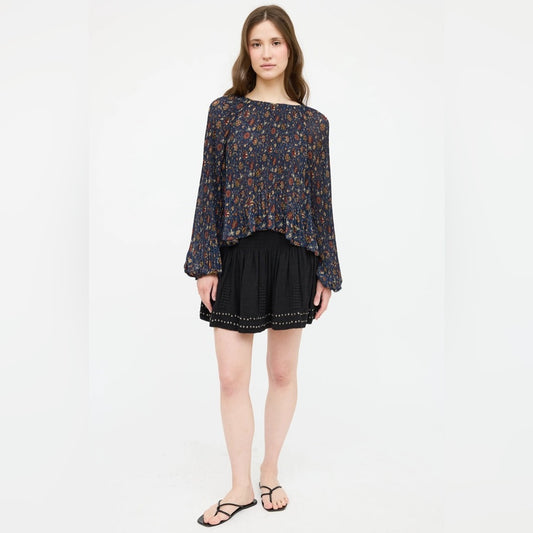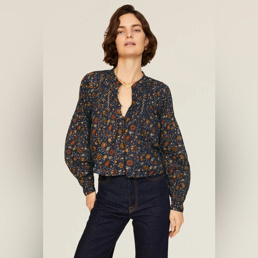 Veronica Beard Navy Floral Smocked Sherwood Blouse, Size 8
