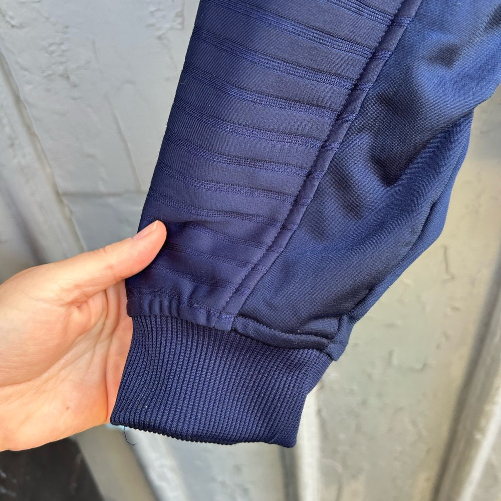 Channel your vintage retro vibes with this early “aughts” track jacket. Typical Adidas stripes, zip front and pockets.