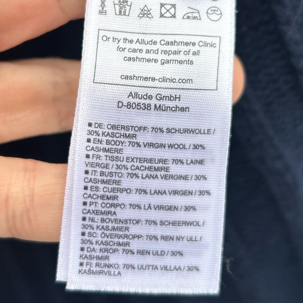 Allude Cashmere Ribbed Turtleneck Sweater. Slightly oversized, boxy cut, side slits. Ethically made and responsibly sourced cashmere and wool. This German luxury company’s brand name was chosen deliberately. To allude : to allude to something, to snuggle up to – a word meaning that is intended to capture the essence of the cashmere label.