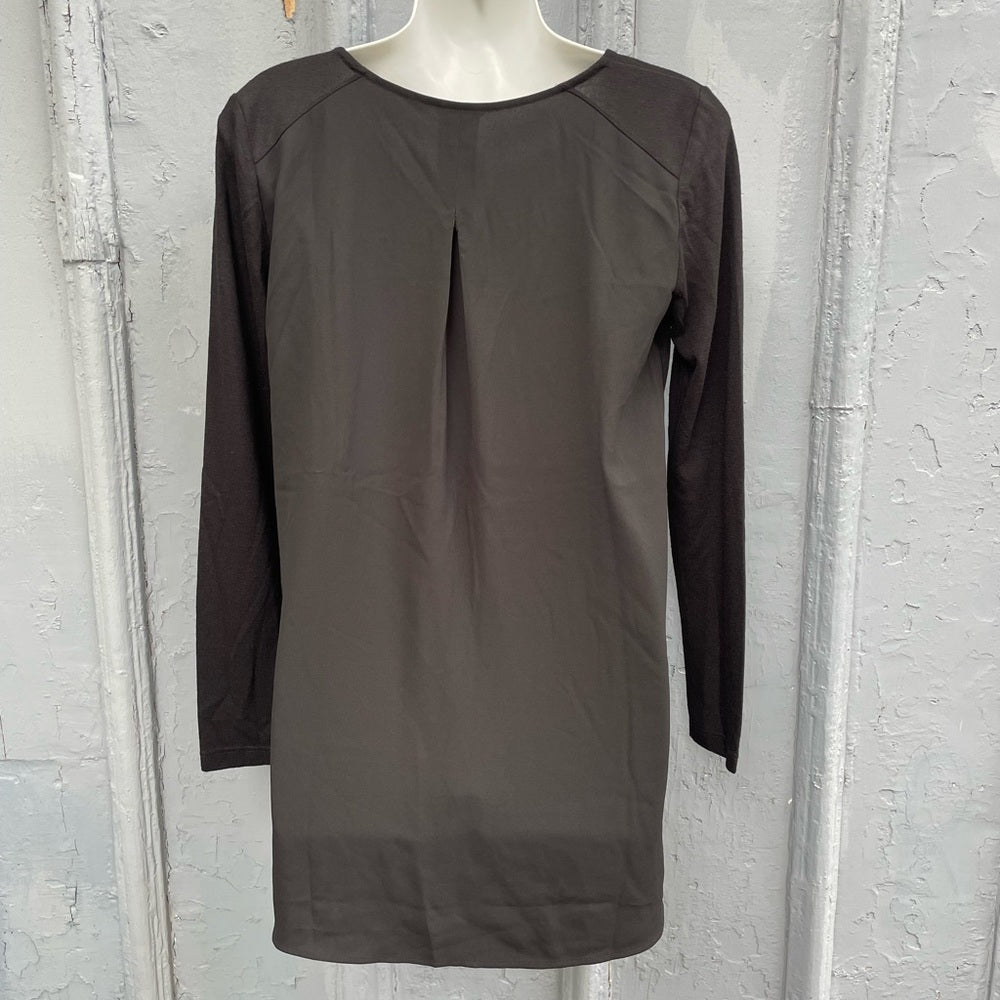 Ann Taylor black knit long sleeve blouse. Front is a light weight soft knit, back is a light weight crepe material with a pleated back.