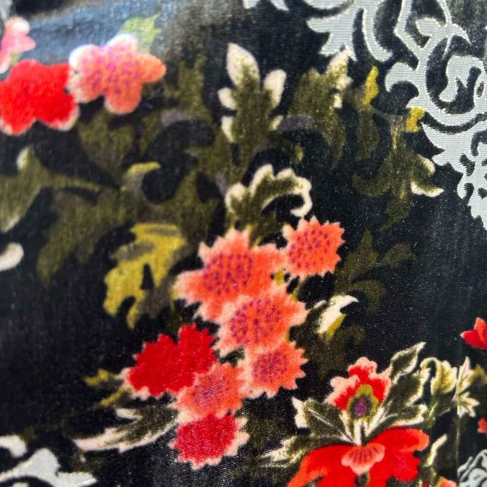 This alluring silhouette enchants with painterly florals on burnout velvet.