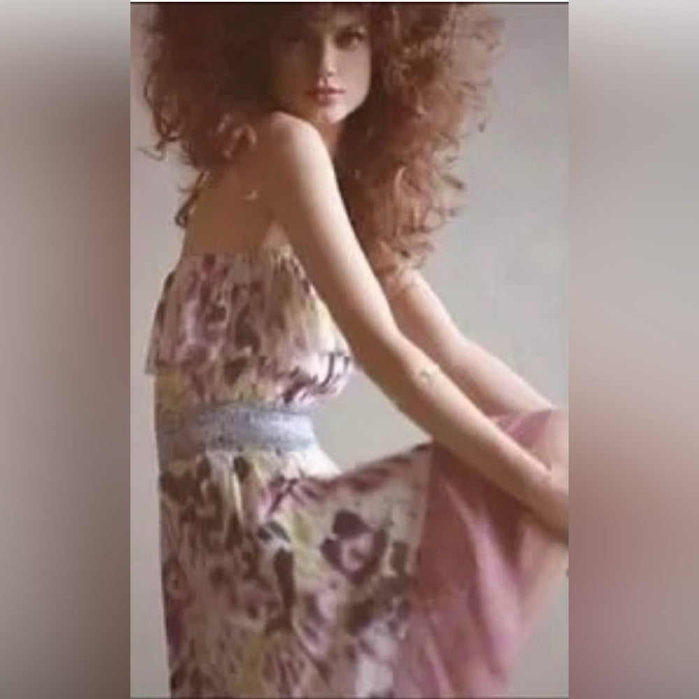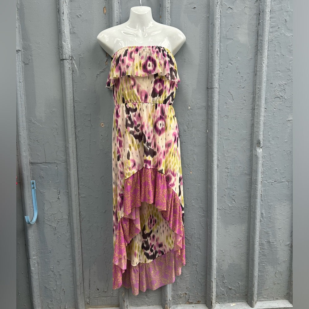 Flirty mesh chiffon high low strapless dress from Lilka Anthropologie. Ruffled detail at the top, high front, low back.