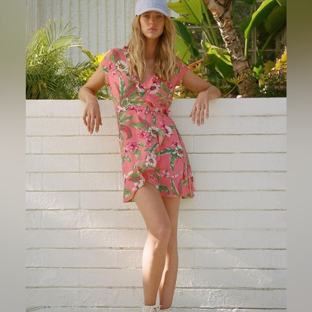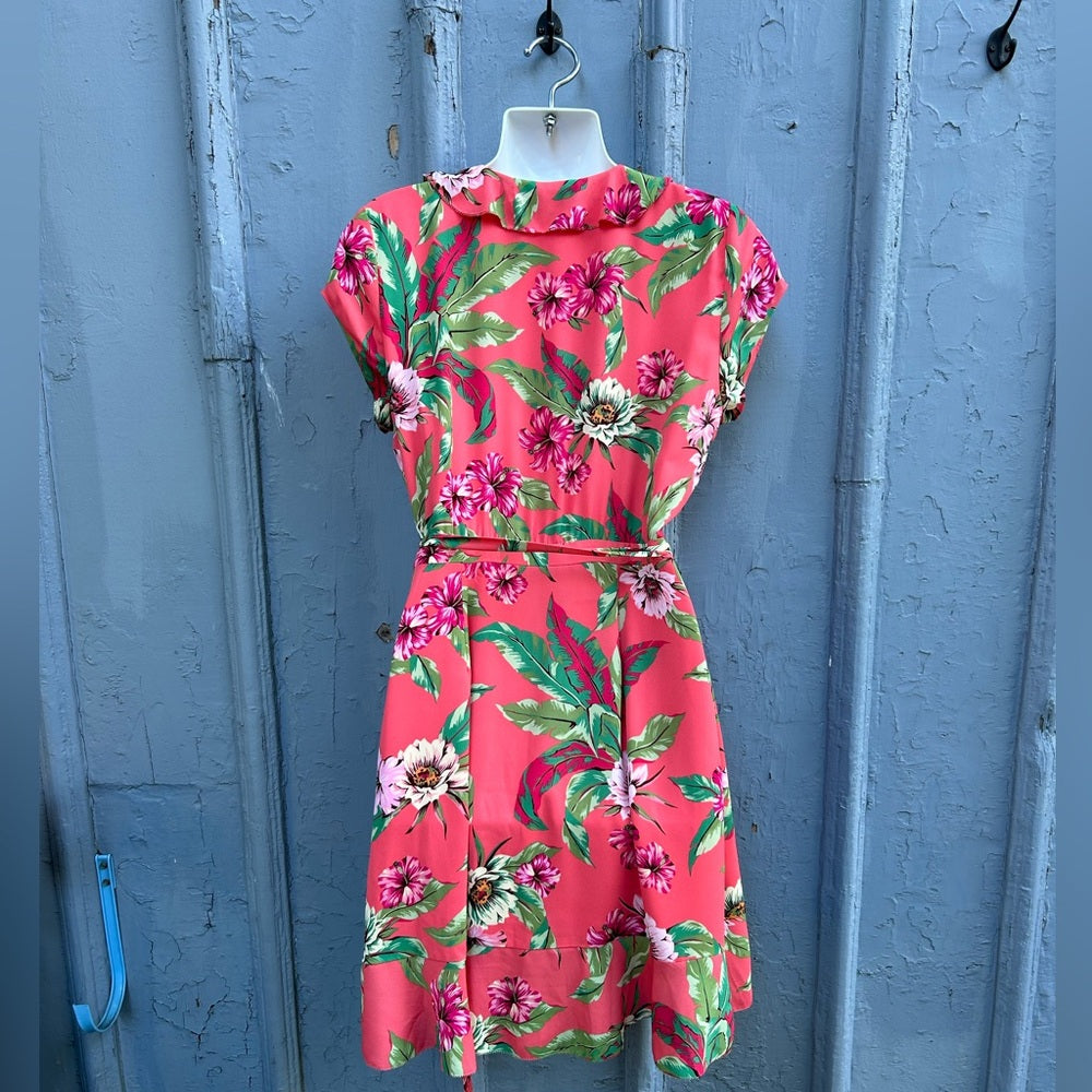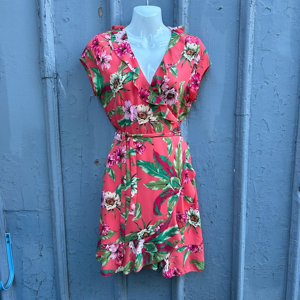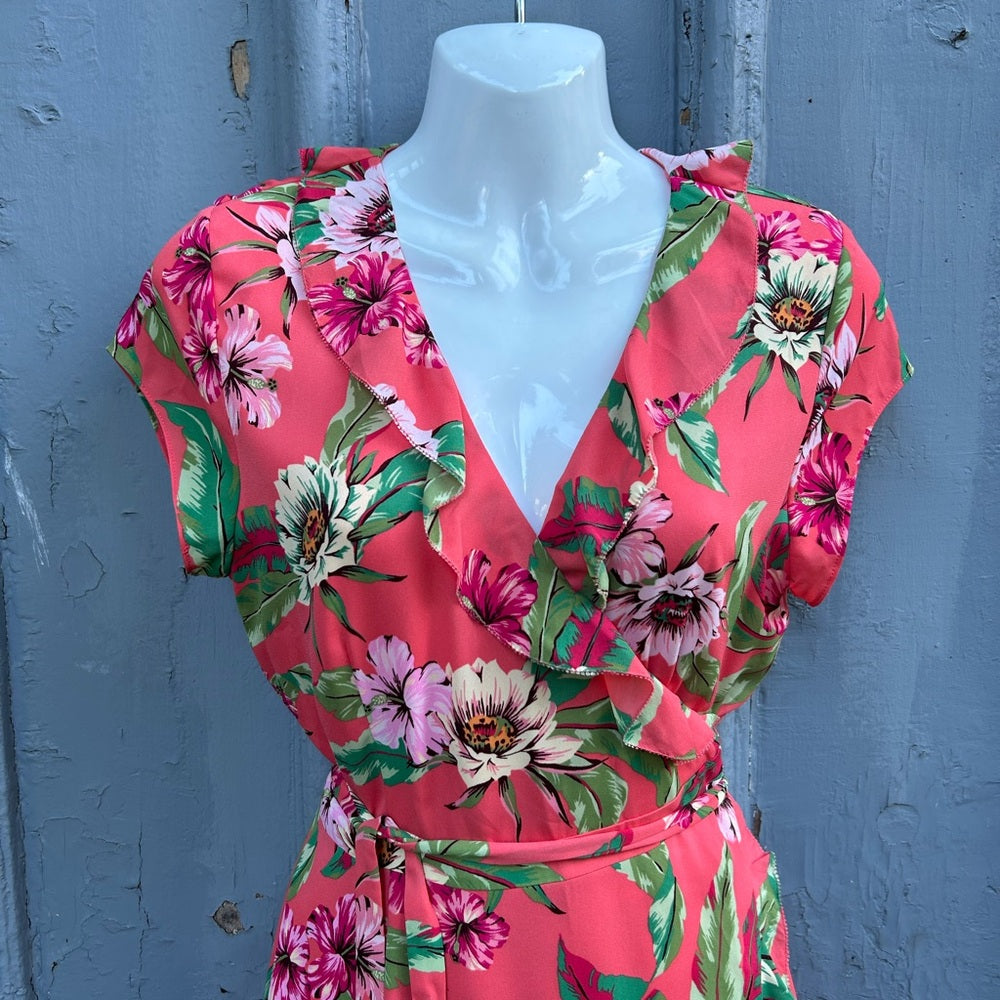 Feminine and Floral wrap front dress from Aritzia Sunday Best. Collared ruffle, cap sleeves, wrap style.