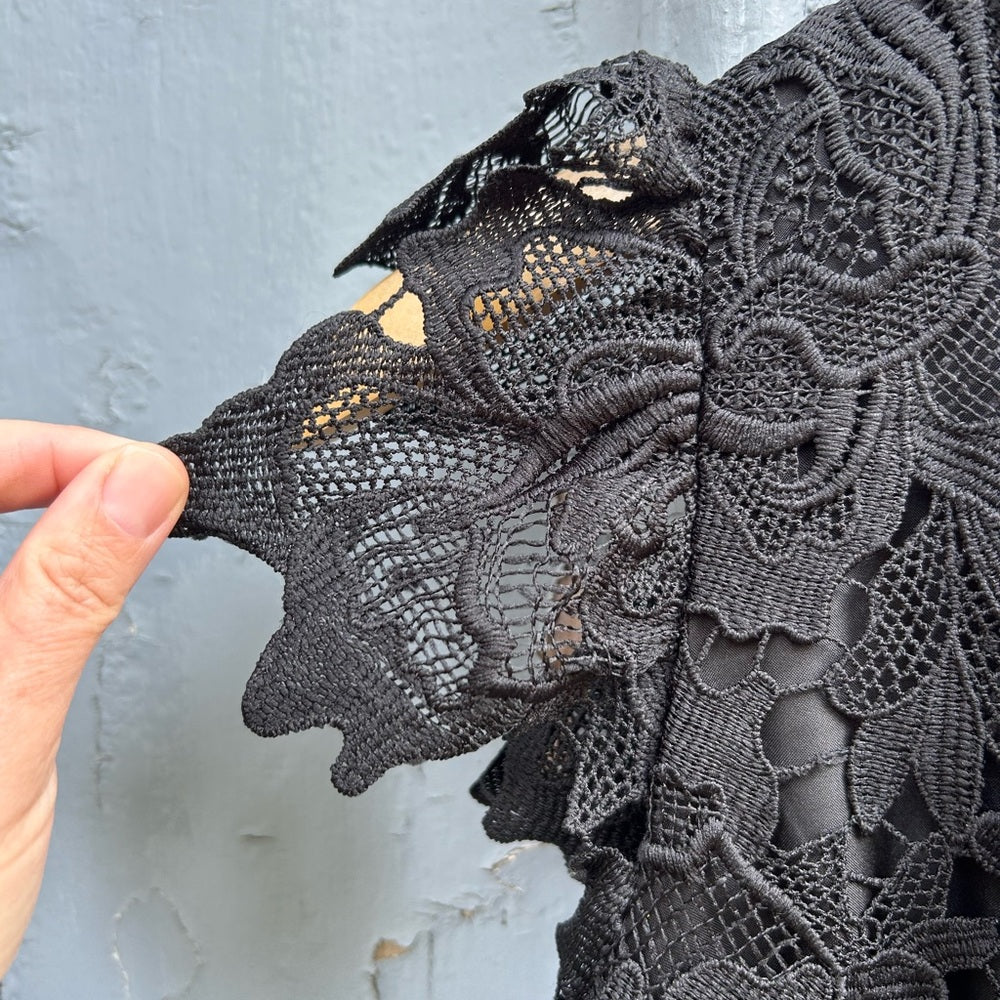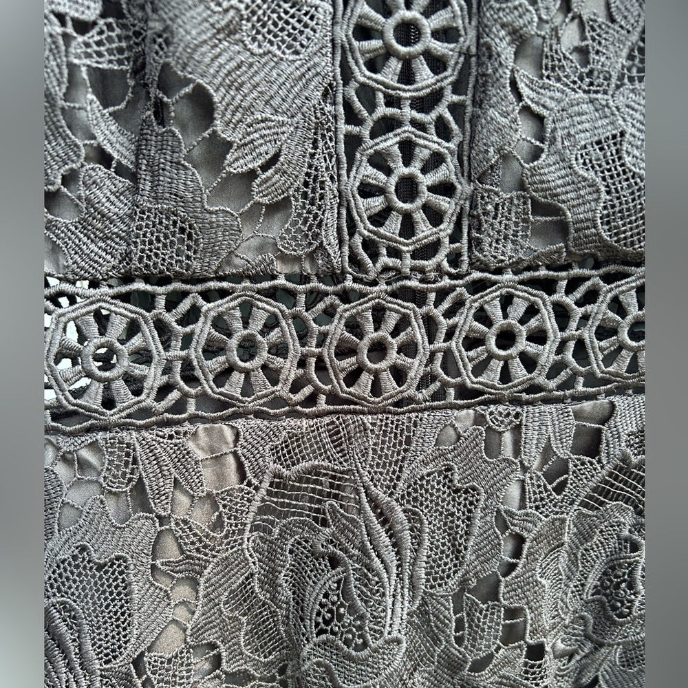 Scalloped lace mini dress with capped sleeves and lace detail on chest and waist. Lined. Back zip closure. One owner. Great condition. Size 0, measures; Shoulder 12” Bust 16” Waist 13.5” Hip 17” Length 34”