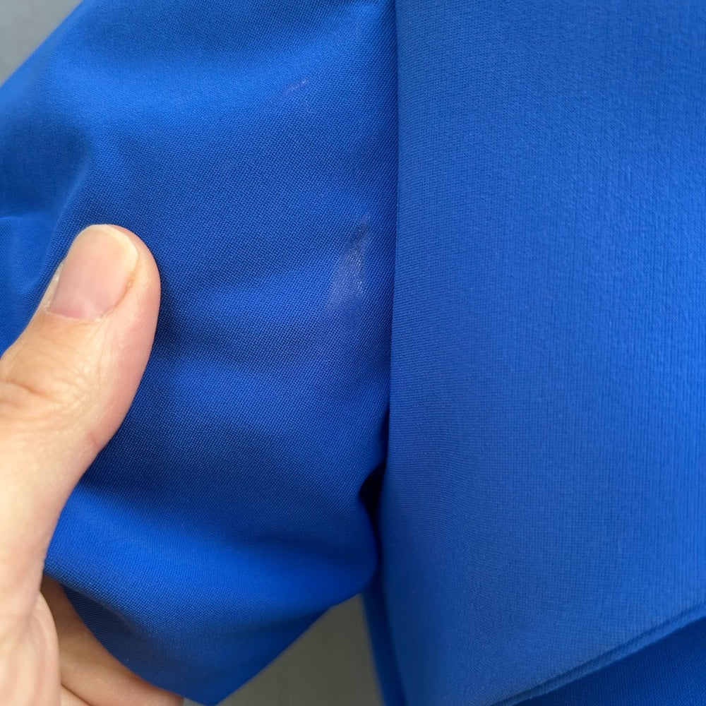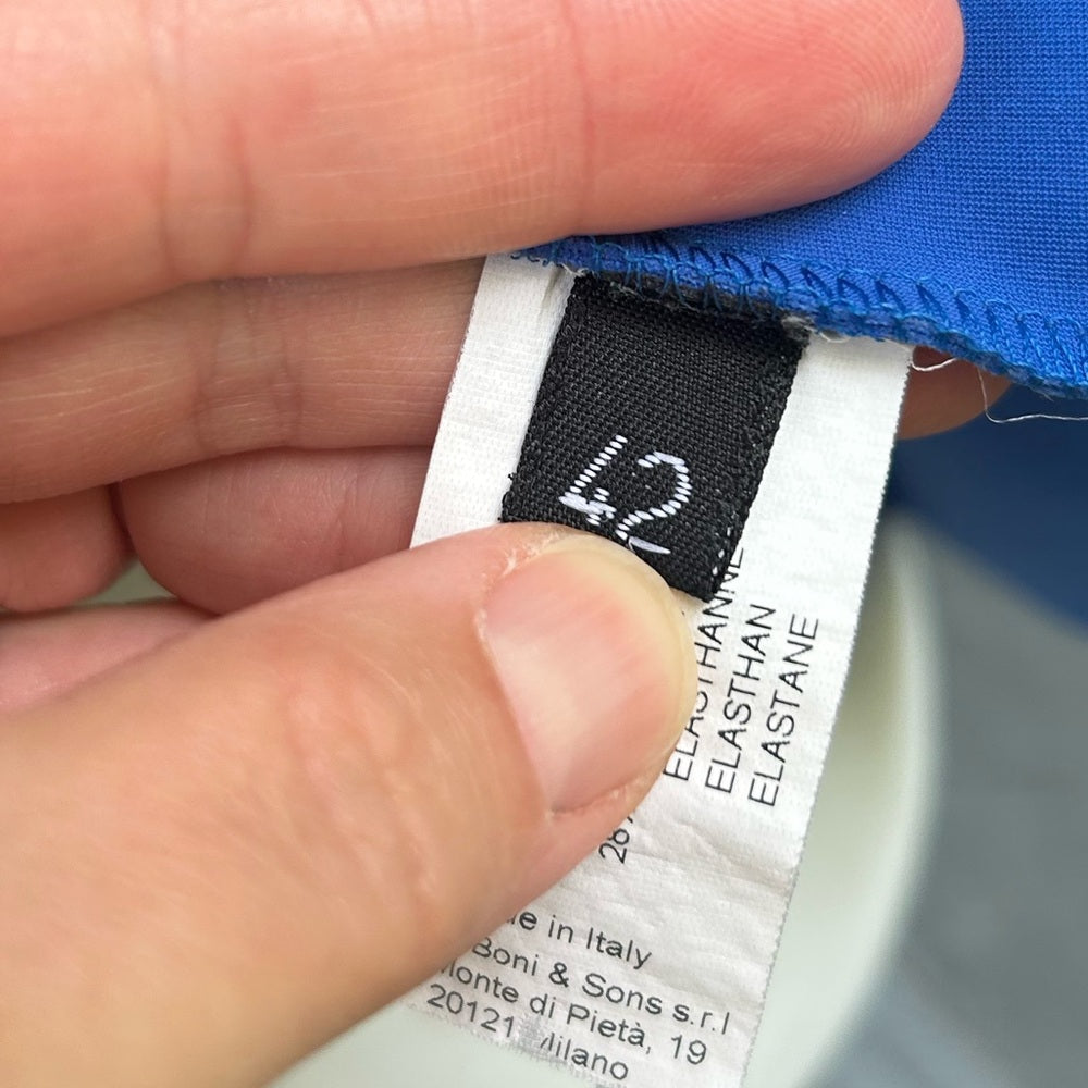 Size 42, approx 8/10; Shoulder 19” Bust 16.5” (lots of body hugging stretch to it) Length 26”