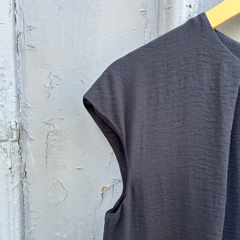 This dress is made from a fluid material with soft neckline pleats at the front and an inverted pleat at the back. An A-line shape, it has neat cap sleeves, a slightly graduated hemline and a hidden zip-up.