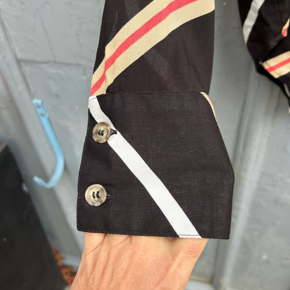 Locally made and designed in Toronto. With a touch of British Burberry feel to it with the neutral and red stripes. Beautifully soft material (no materials tag, sorry).