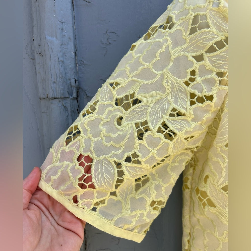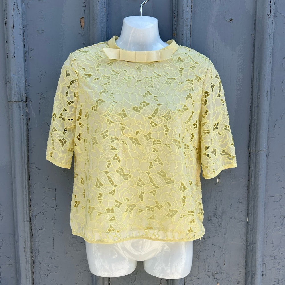 Stunning lace overlay blouse from Edward Achour Paris. Lined, except sleeves. Sweet bow at neckline. Side zip.