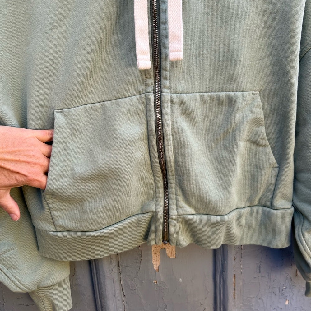 Keep your weekend cozy and cool with this Organic Cotton Zip front hoodie. In subtle seafoam green, 2 side pockets and a cropped hem, throw on your favourite jeans and you’re ready to roll.