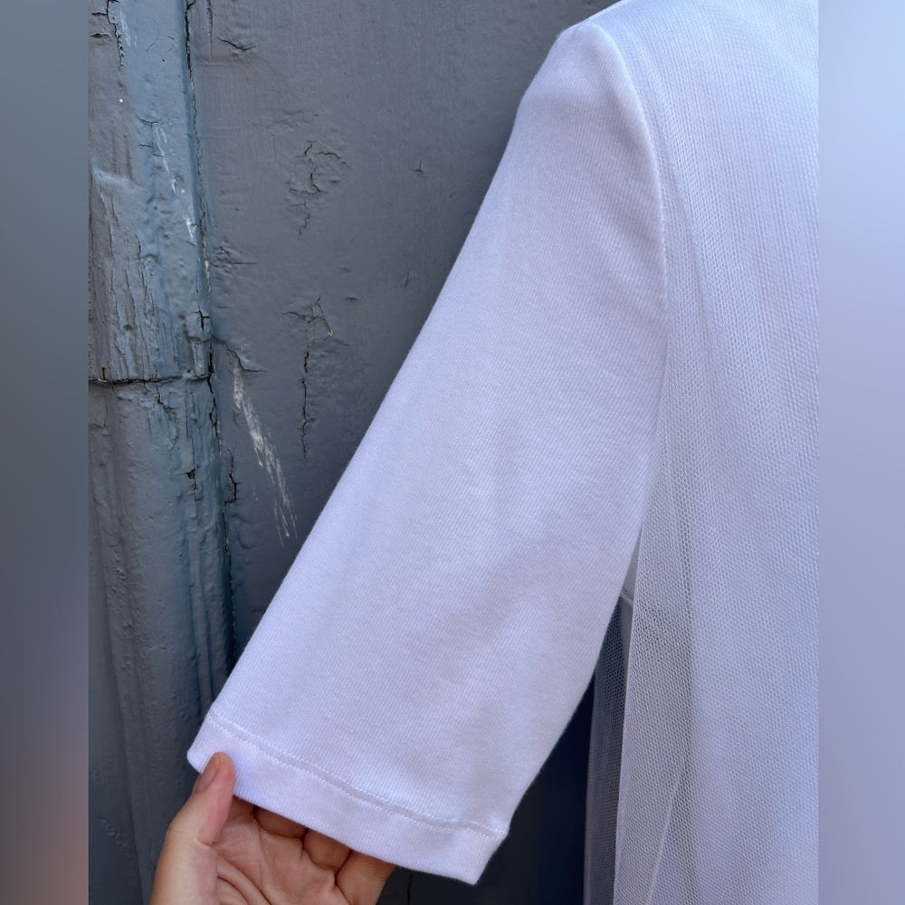For fans of quiet luxury and Brunello Cucinelli, may I present this stunning Fabiana Filippi Knit T shirt blouse. Knit tee with a mesh overlay, silver chain detailing with “feathers” of crepe de chine. A statement piece of there ever was a quiet luxury statement piece.