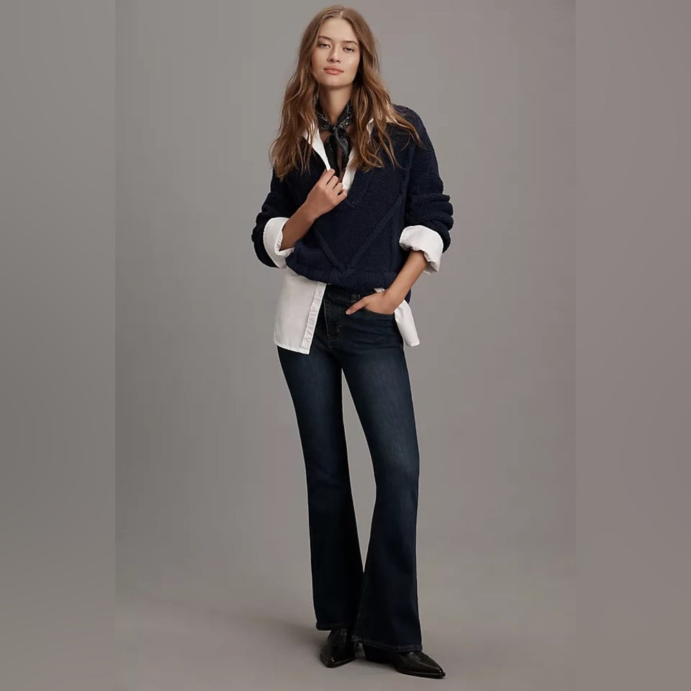 This high rise flare jean is designed for a slim fit through the hips, thighs, and knees, with a gentle kick that’s slightly roomier than a straight leg. Perfect for the office, style yours with tailored blazers and button-down shirts.