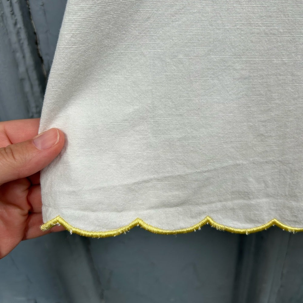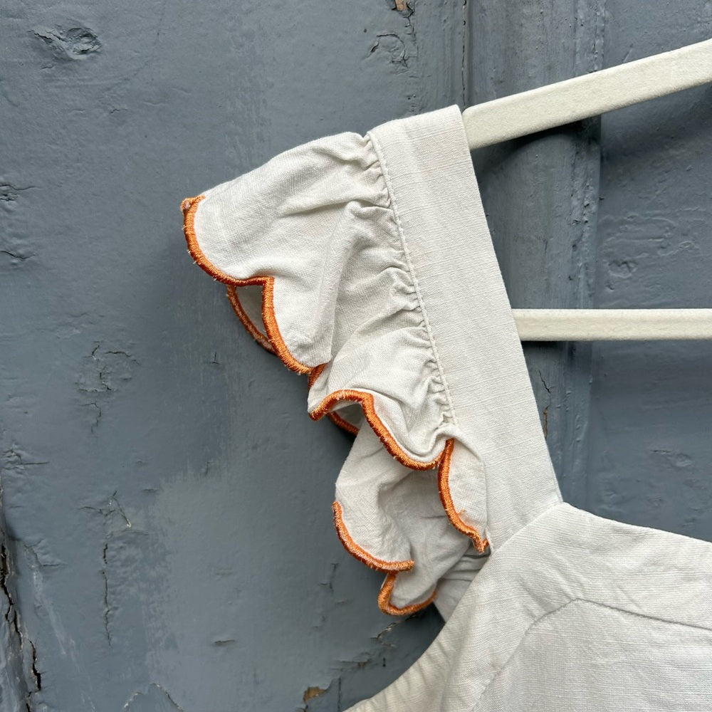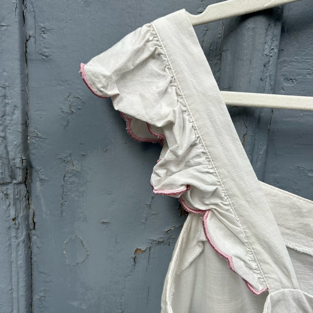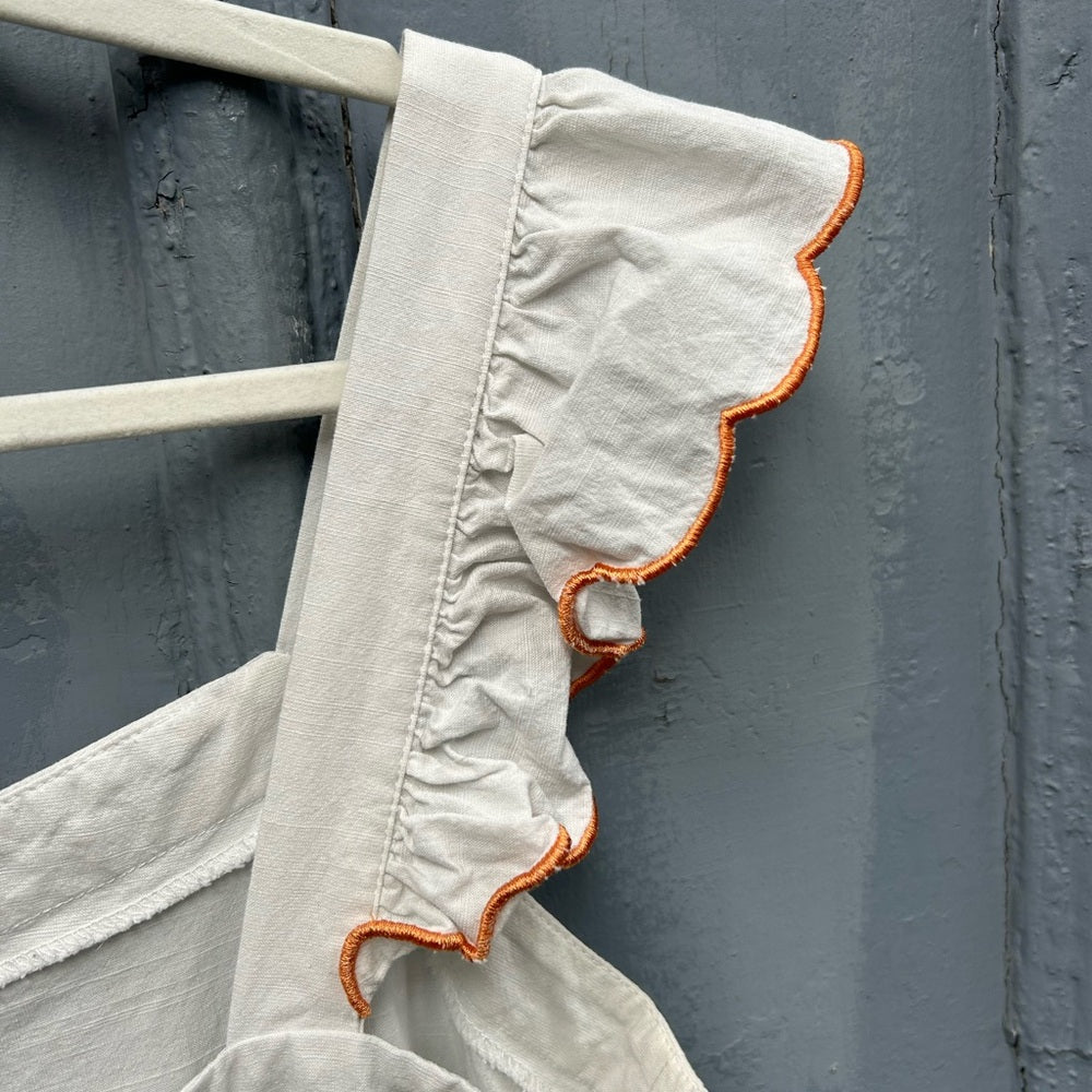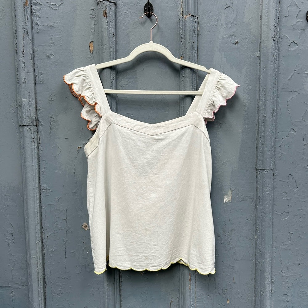 With the most elegant retro feeling stitched edging this beautiful cotton sleeveless blouse is the perfect summer addition. With a tie back detailing pretty neckline and ruffled shoulders it’s the sweetest part of your next outfit.