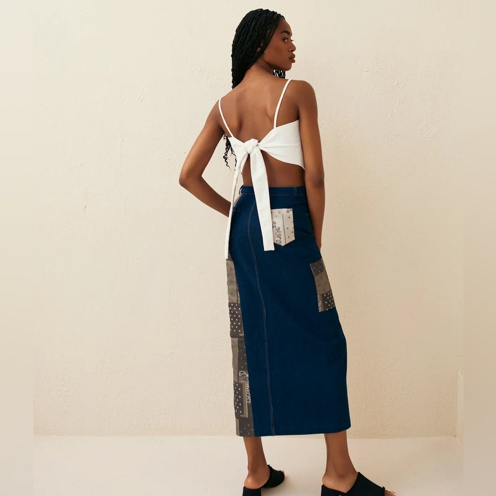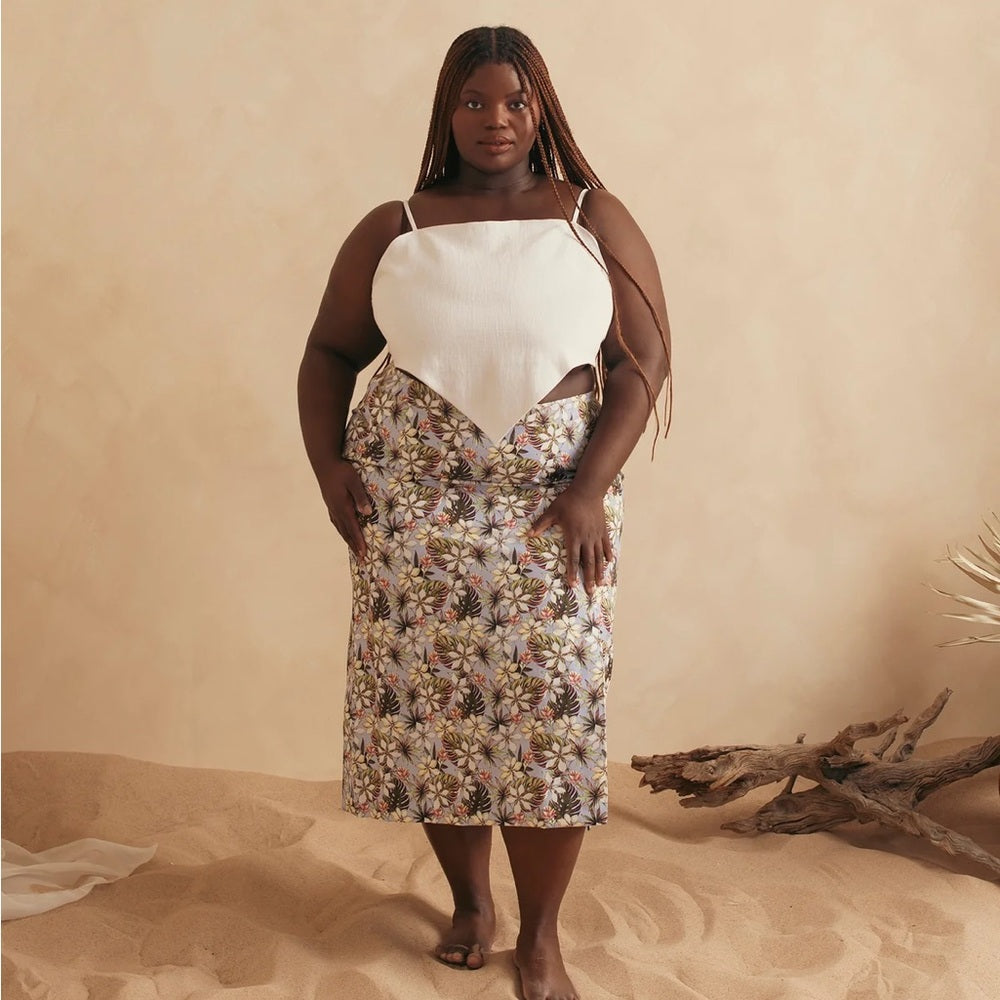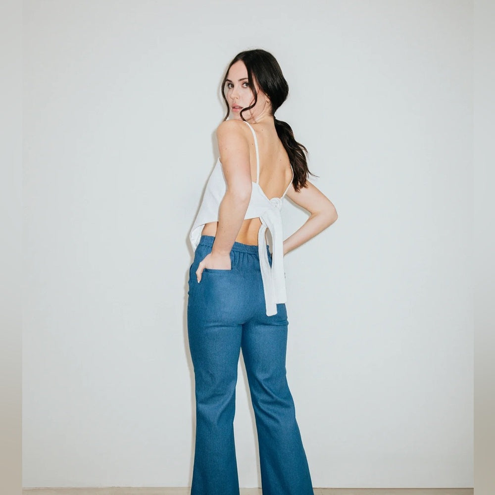 This is a breezy open back tank top that has a handkerchief silhouette for the front and a thick tie back. This is a structured Linen fabric that holds it's shape but is still lightweight. It's the perfect top for summer if we do say so ourselves.