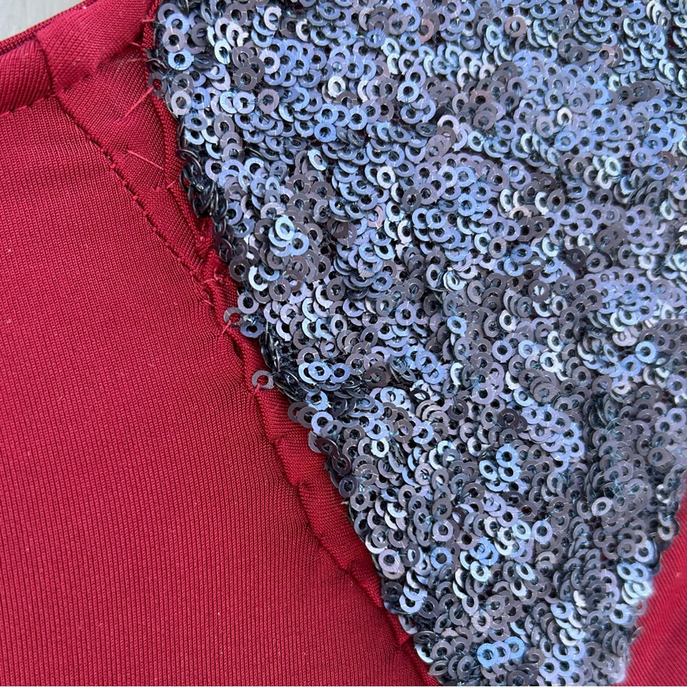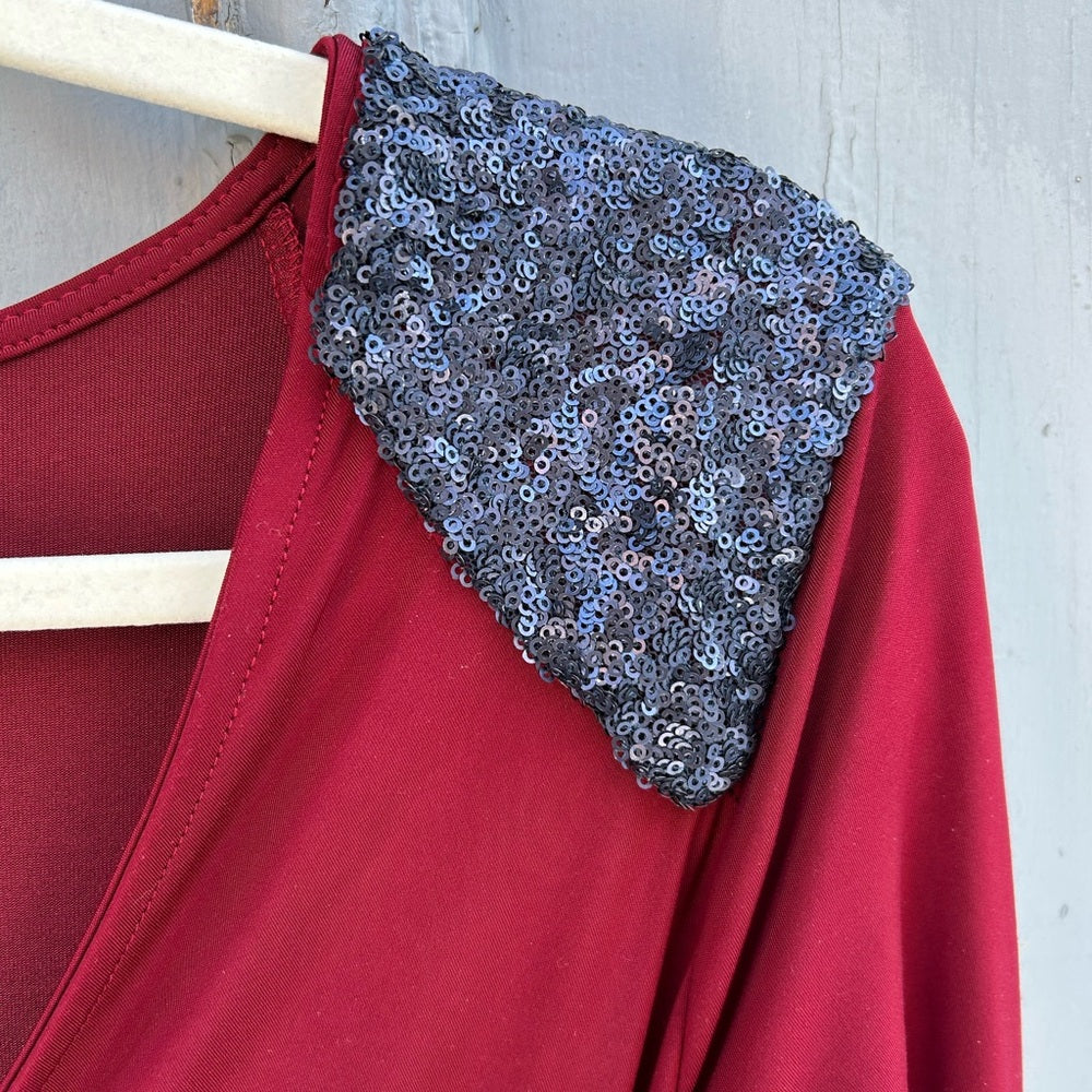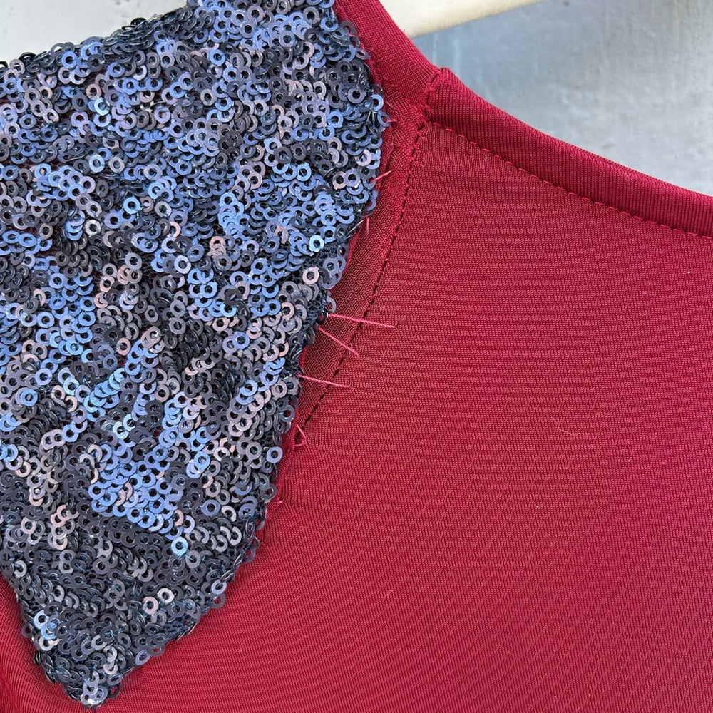 In very good condition. The shoulder sequins have a bit of pulling at the rear, pictured. One small stain on one of the arms, pictured.