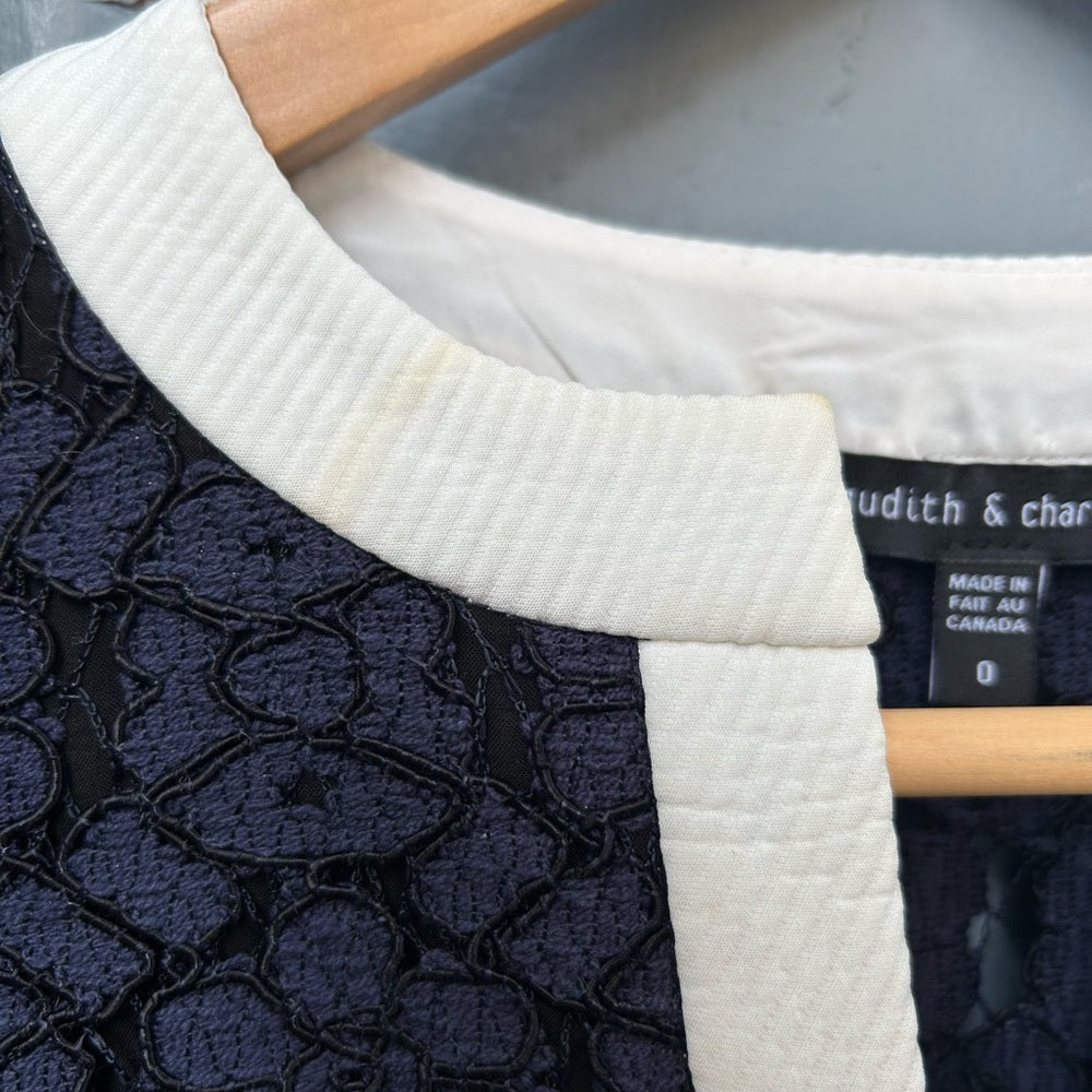 One owner. Great condition, lace is in very good shape. A bit of makeup staining on collar, pictured. Not stain treated, have not tried to remove, didn’t see it until photographing.