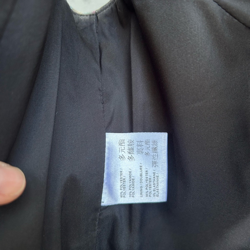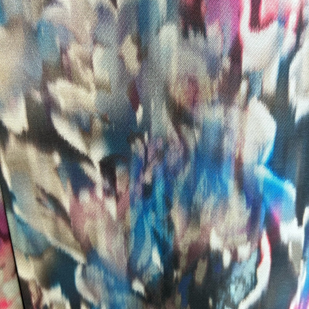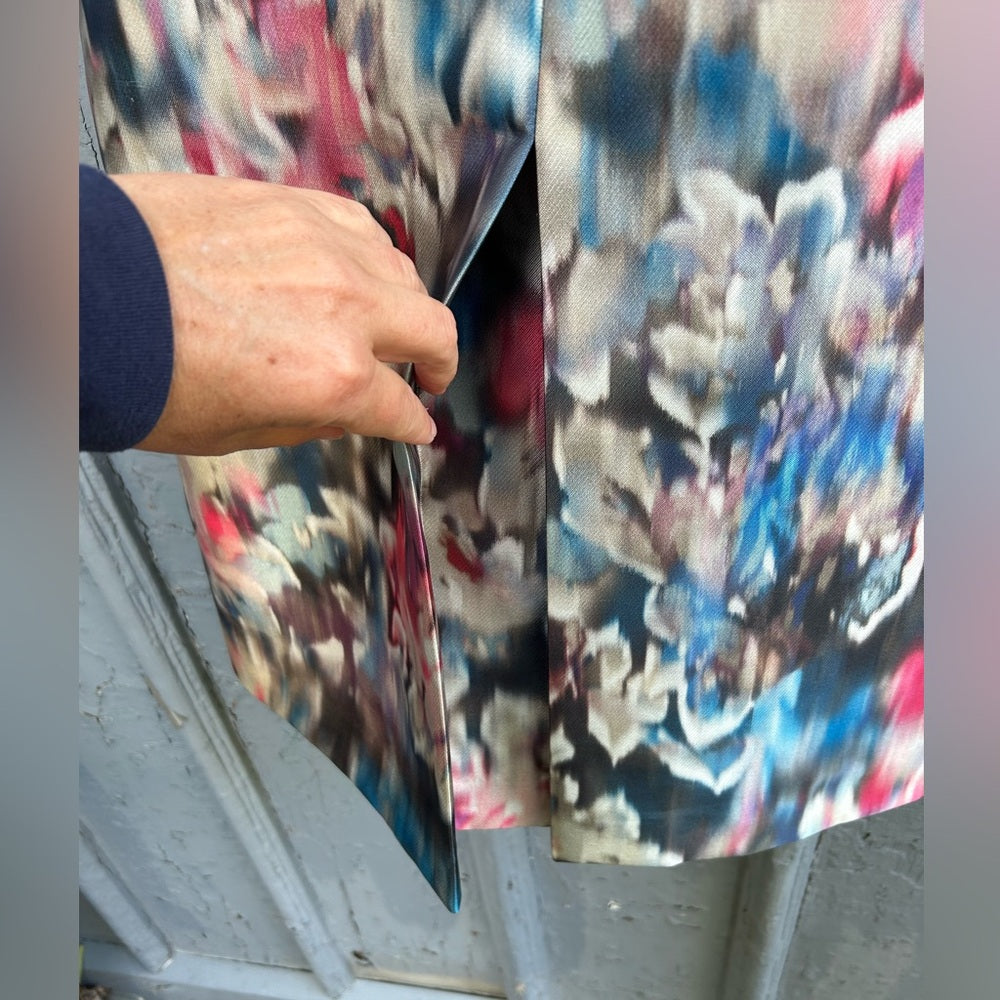 With a beautiful abstract floral design this lightly fitted and flared sheath is the perfect addition to a summer office wardrobe. Pleated front skirt and a belted style waist. Zippered rear entry. One owner. Excellent condition.