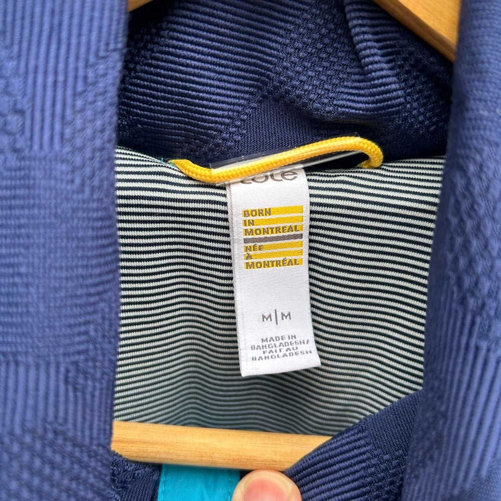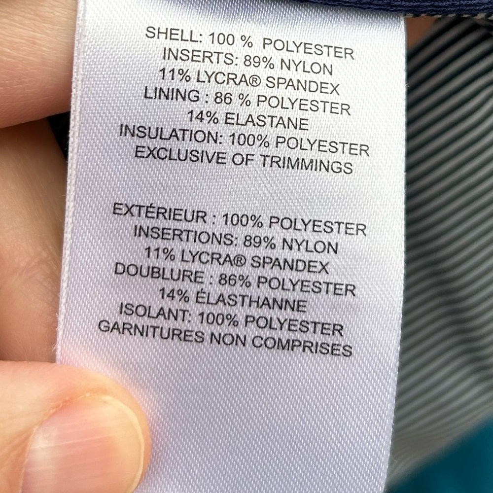 Lole running jacket. Padded middle section with stretch sides. 2 side pockets. Perfect for the cooler season running, as a layer for skiing, or just as a cooler jacket. Zip front.