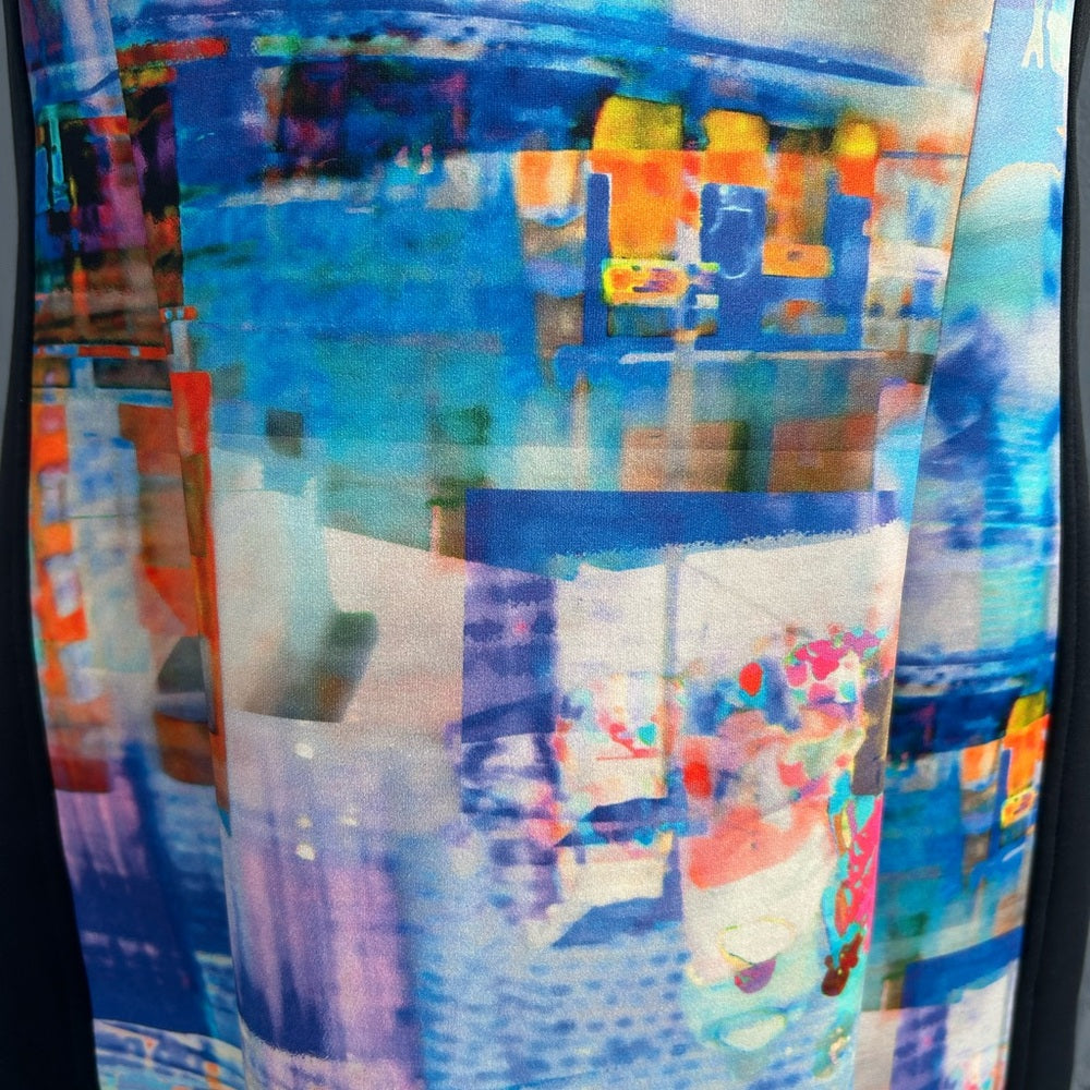 A vibrant front panel with a stretchy almost scuba style material makes this pretty dress stand out. Fantastic for layering.