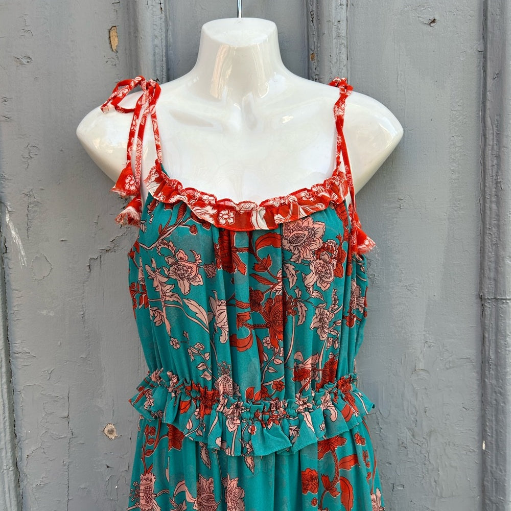 Miss Los Angeles Nati Tie strap midi dress. Contrast tie and ruffle accent. Elastic waist. Tiered, lined body.