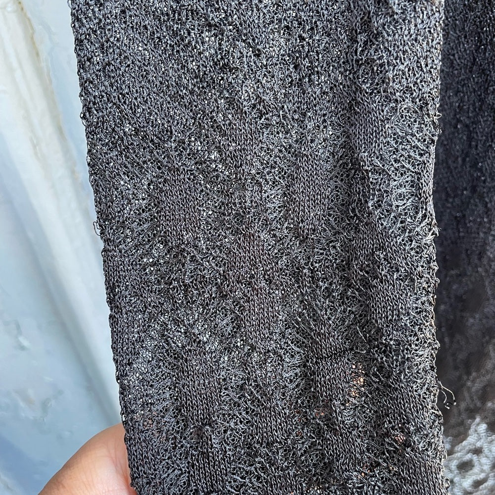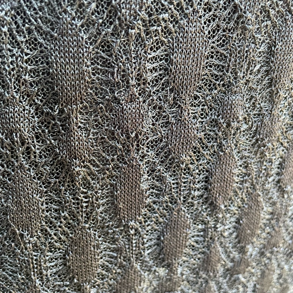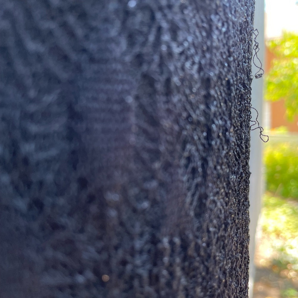 One owner. Fabric tag has been cut so I can’t tell you exact knit. The knit also has a few snags, as is to be expected with a fine knit. I have tried to picture as best as I can, it is hard to see as the garnet is black.