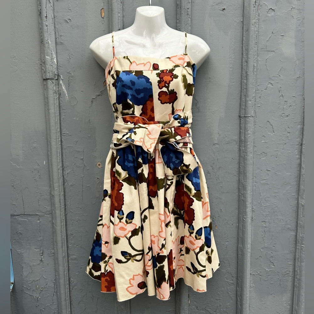 M by Missoni Cotton floral smocked back dress. Spaghetti straps, square bustling, smocked backing adds stretch, tie can be worn multiple ways. As worn by Emilia Fox.