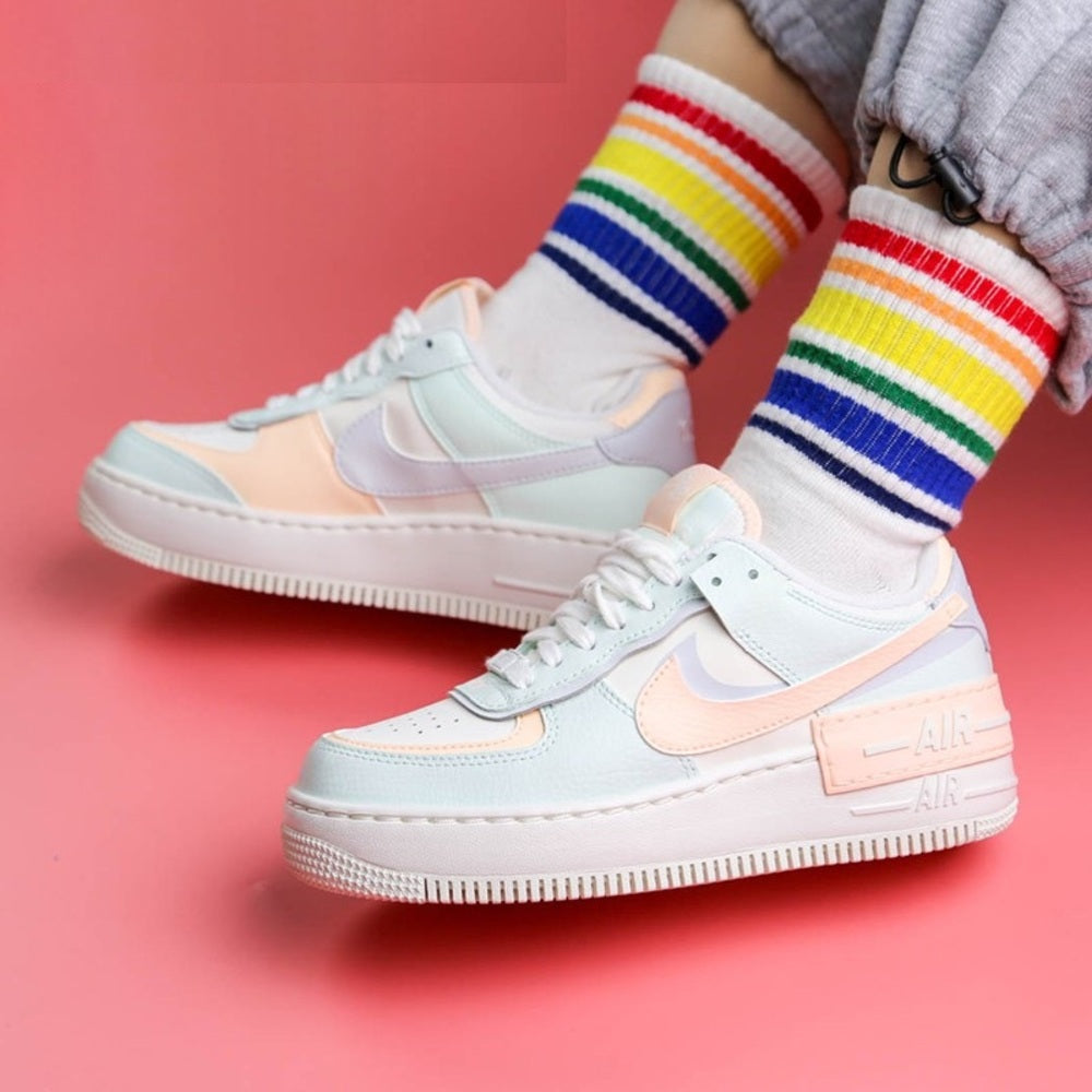 Put your best foot forward. Crafted from light blue, pink and white leather, these Air Force 1 Shadow sneakers from Nike are sure to get you through the day in style.