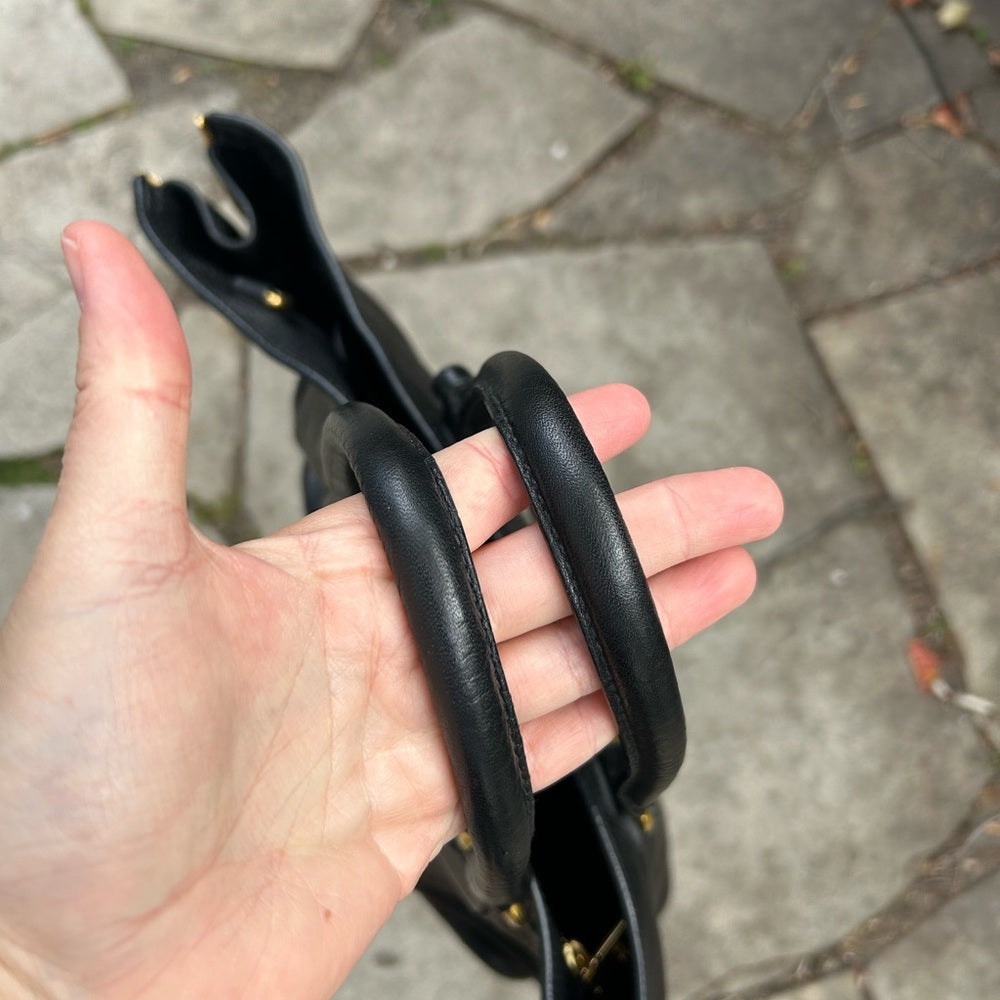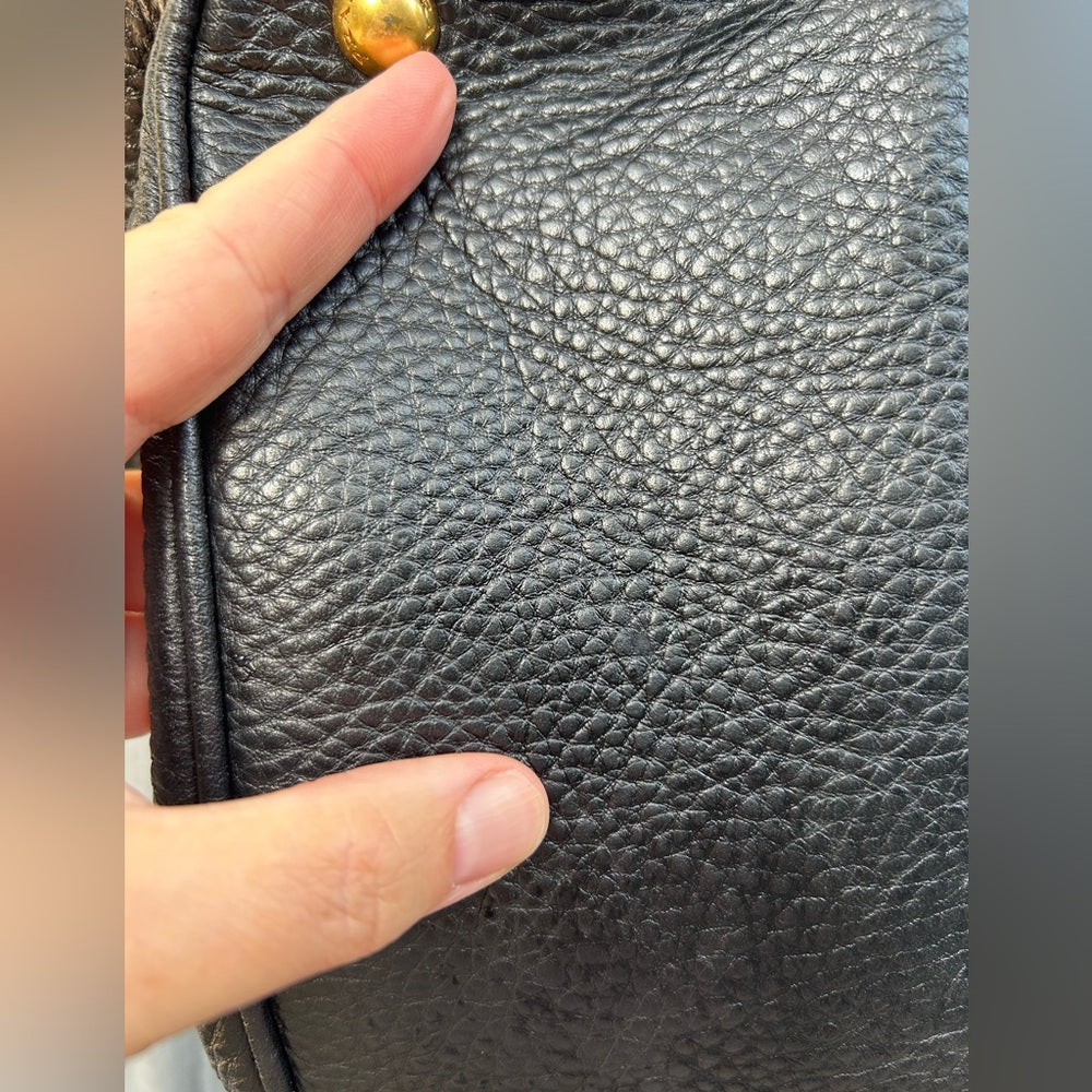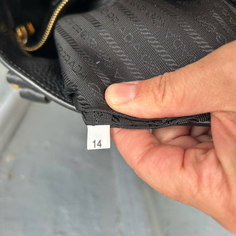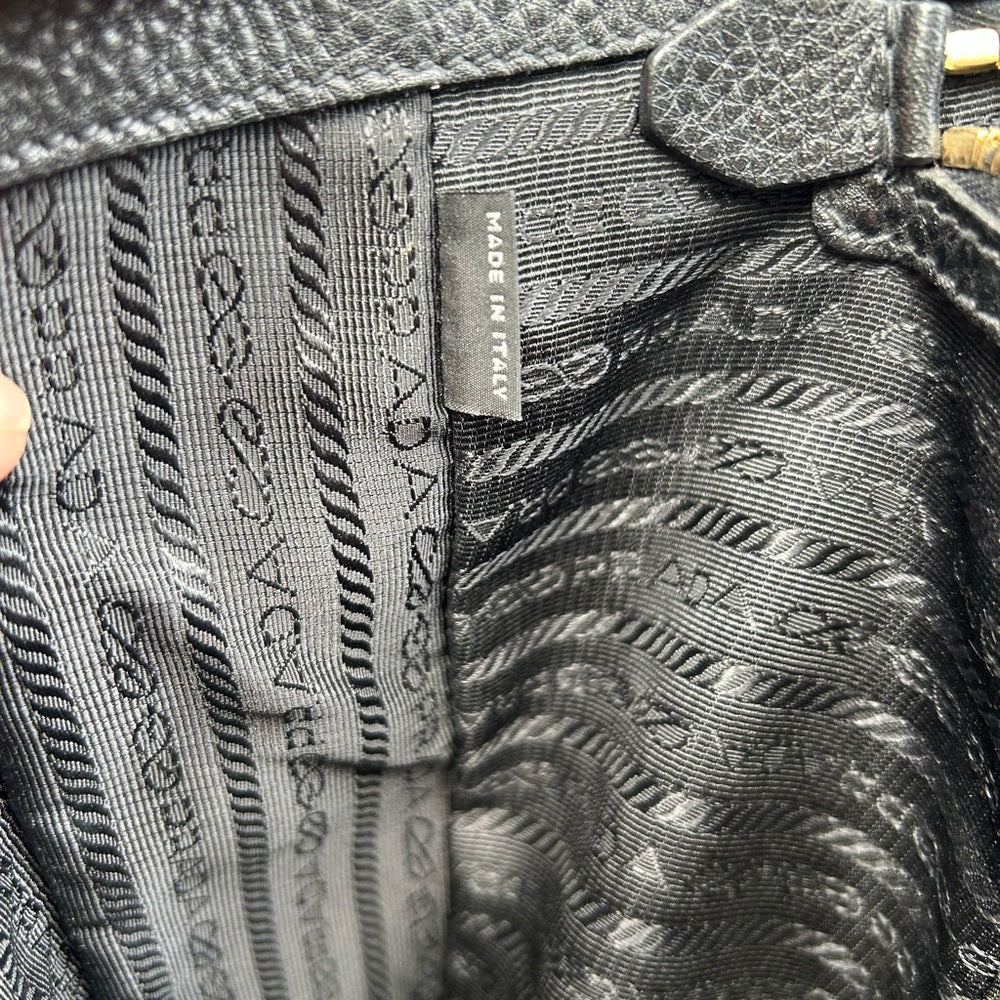 High quality Black Pebble grained leather with Gold zip sides. Interior is lined with Prada signature fabric. Gold tone metal hardware adorns this tote.