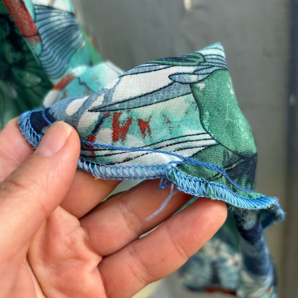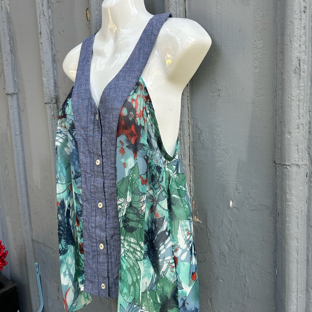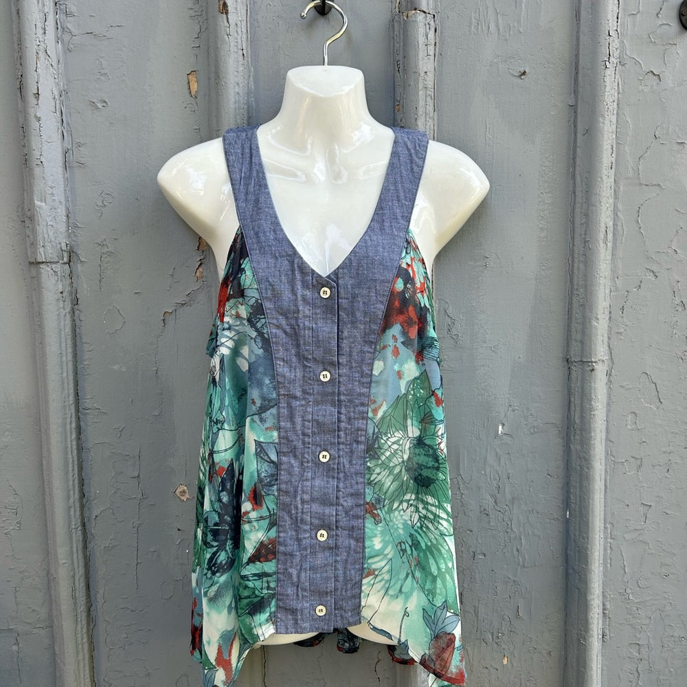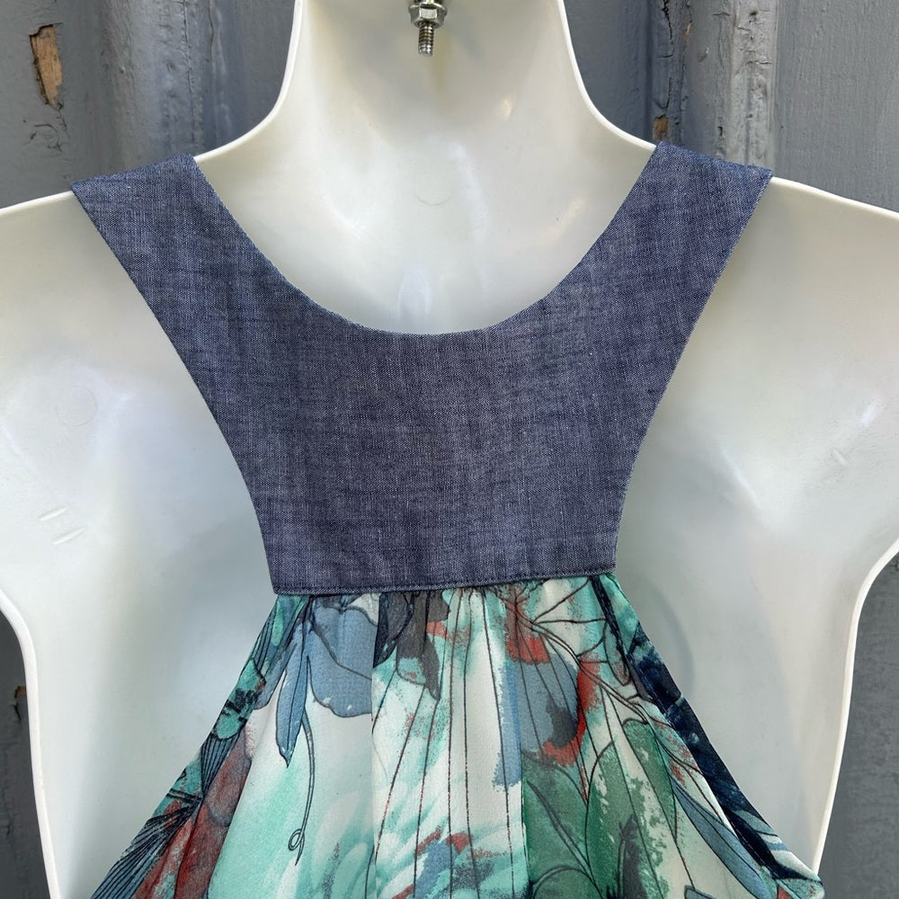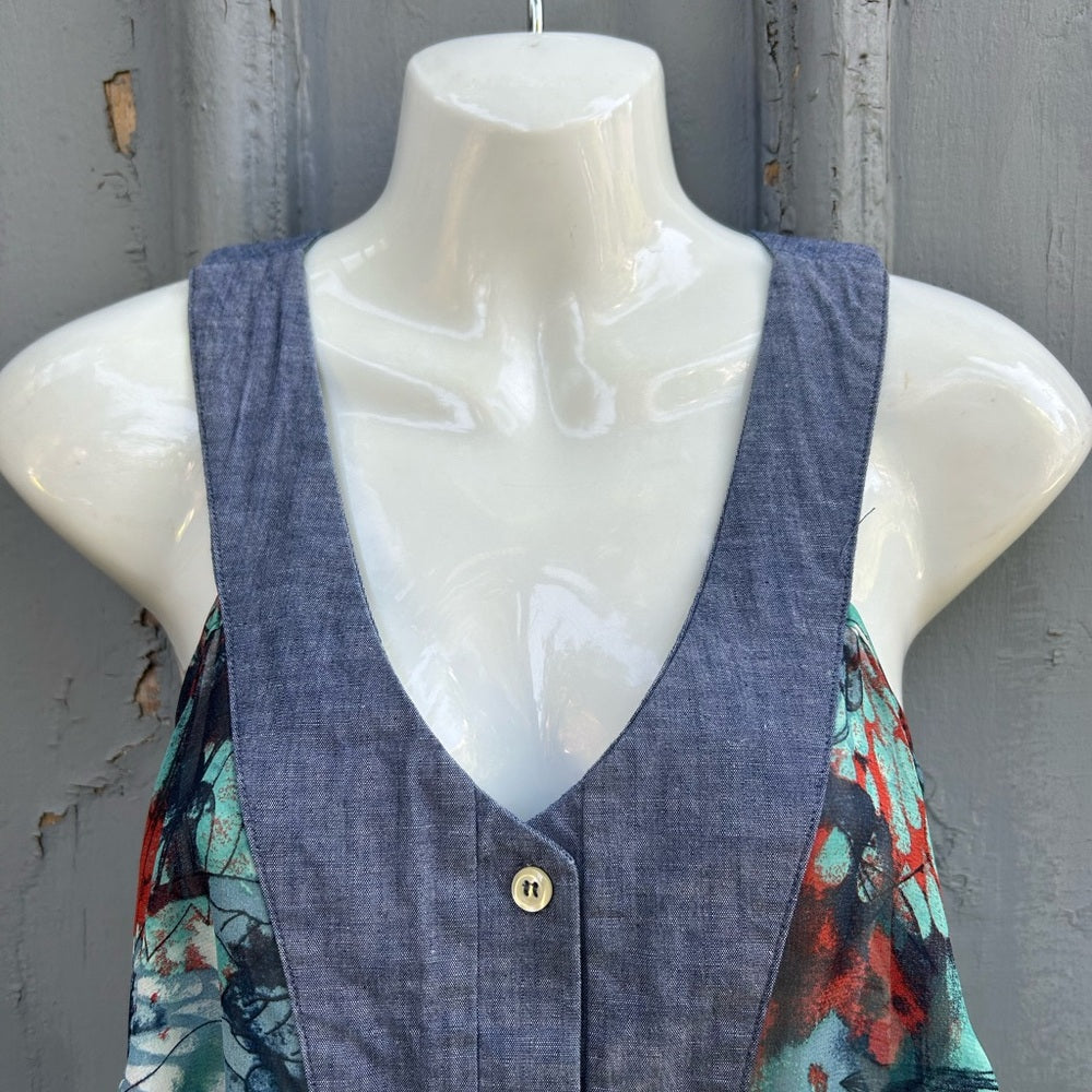 Sweet Preloved Sleeveless Blouse. One of Torontos favourite local designers combining unused and secondhand materials to make new items. This sleeveless blouse combines a denim cotton style yolk with chiffon sides. Designed and made in Toronto.