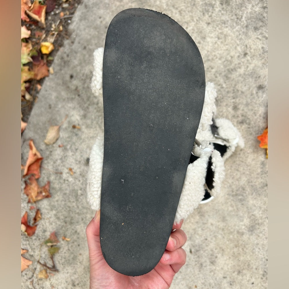 White shearling Rag & Bone Evin sandals with leather trim, rubber soles and buckle closures at tops. Platform 1.5”