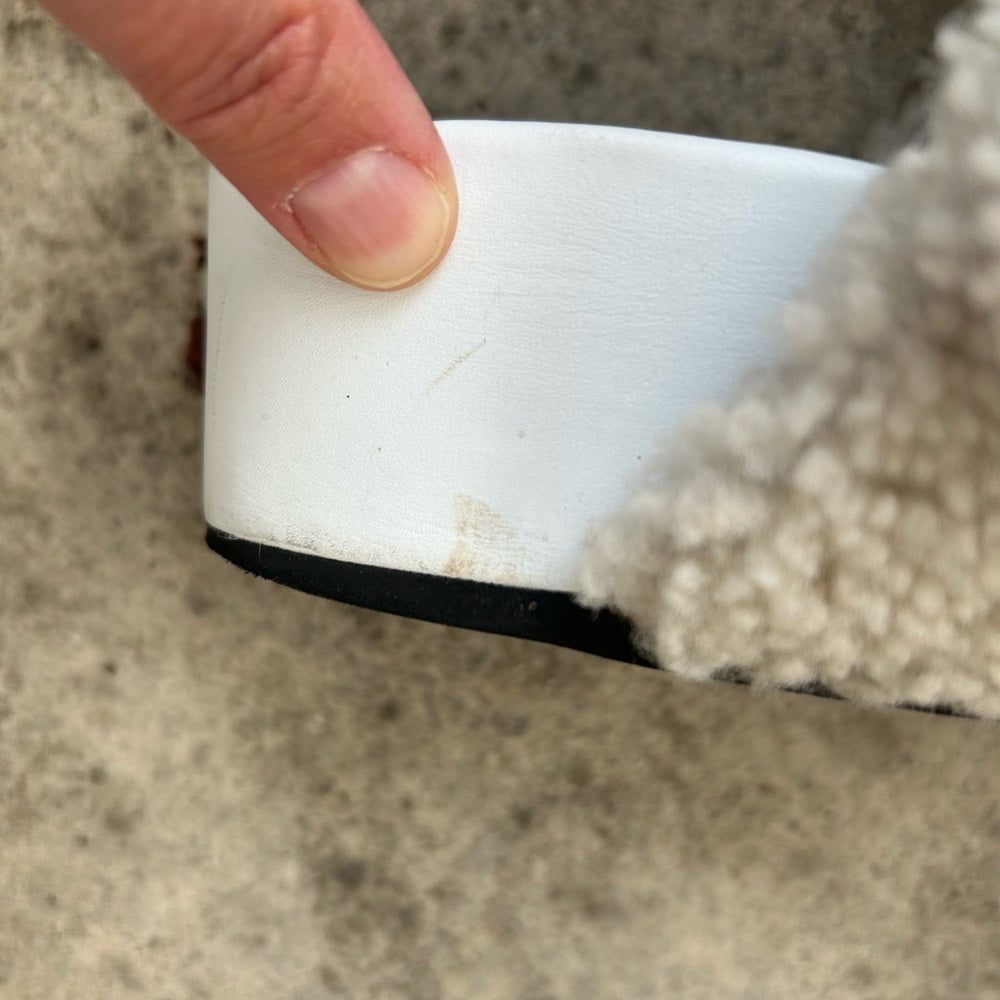 One owner. Good condition. The shearling is in great condition. A few marks on platform, I’ve tried to illustrate as best as I can.