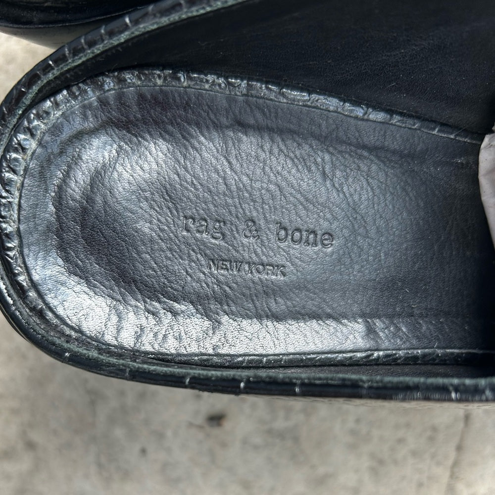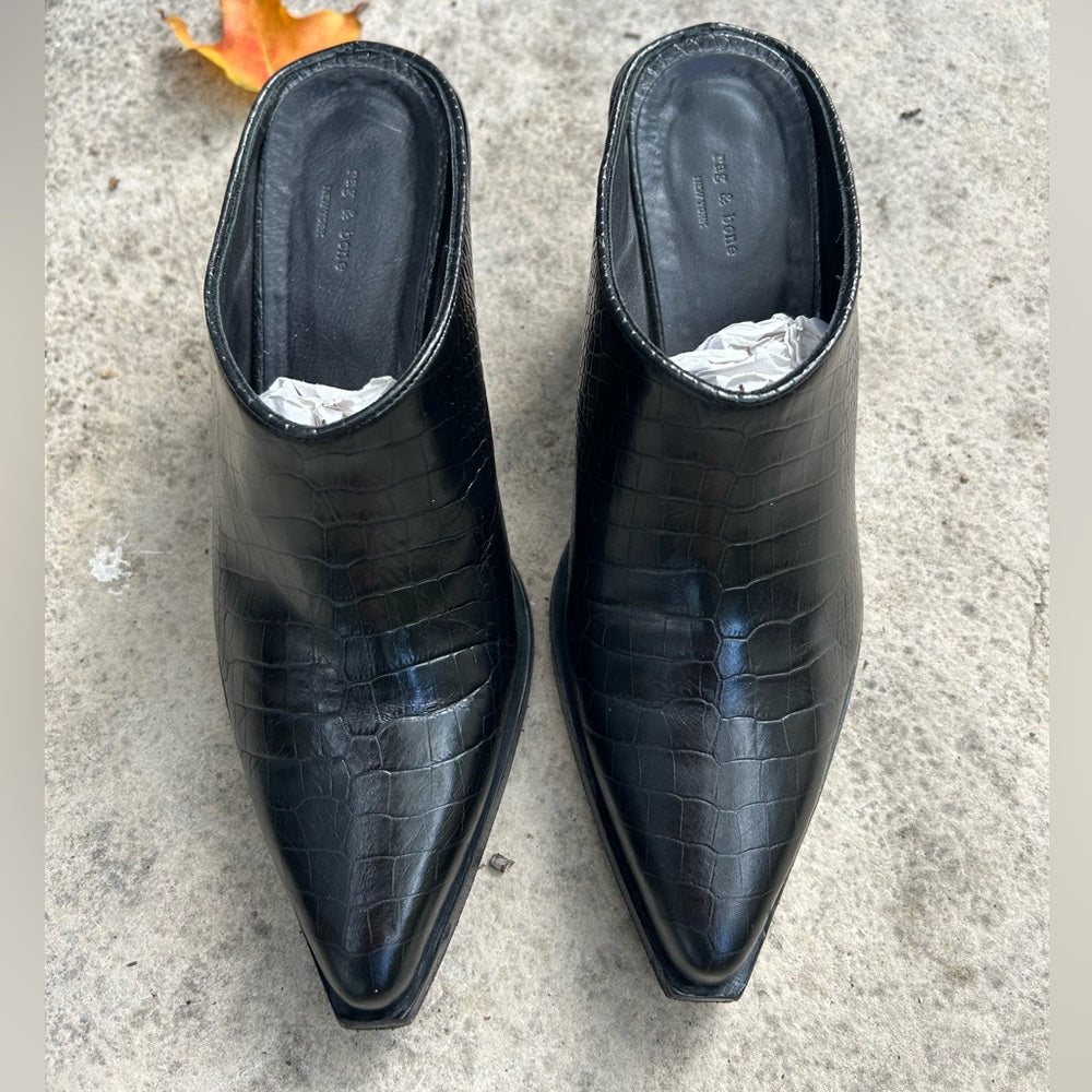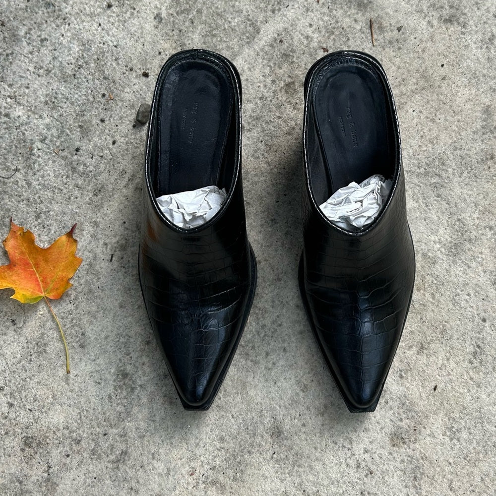 Pointed-toe Rag & Bone mules crafted in bold, croc-embossed leather. Inset, stacked wedge with a rubber cap. Leather sole. Leather: Calfskin. Made in Italy.