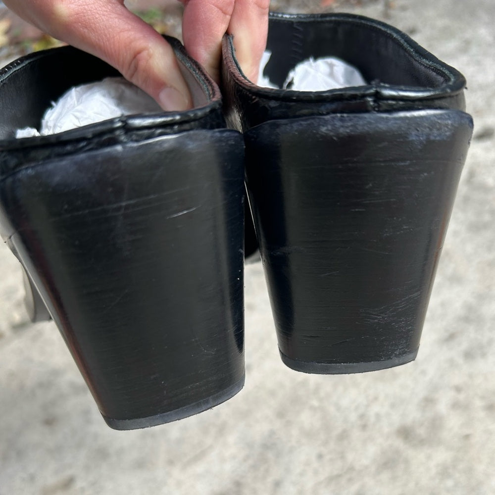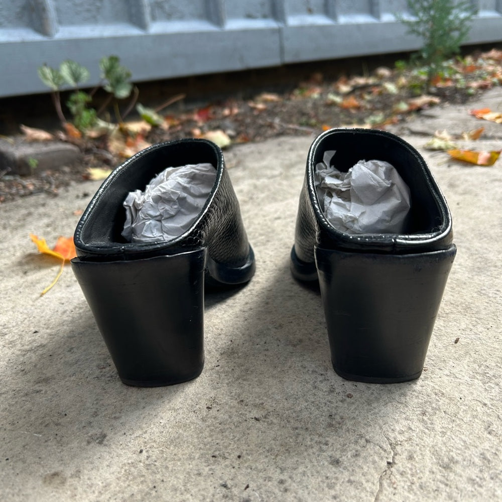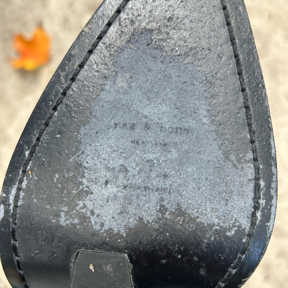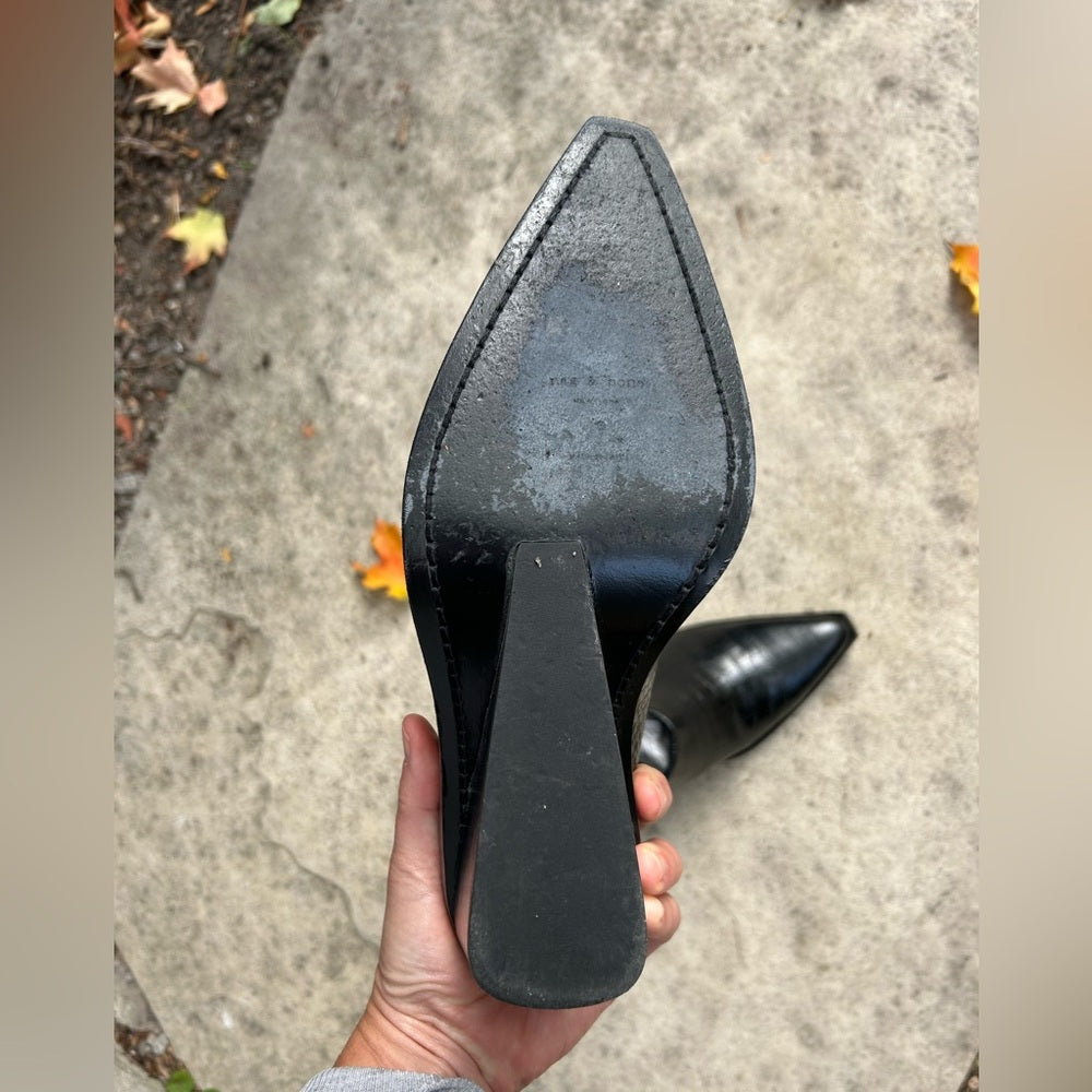 Pointed-toe Rag & Bone mules crafted in bold, croc-embossed leather. Inset, stacked wedge with a rubber cap. Leather sole. Leather: Calfskin. Made in Italy.