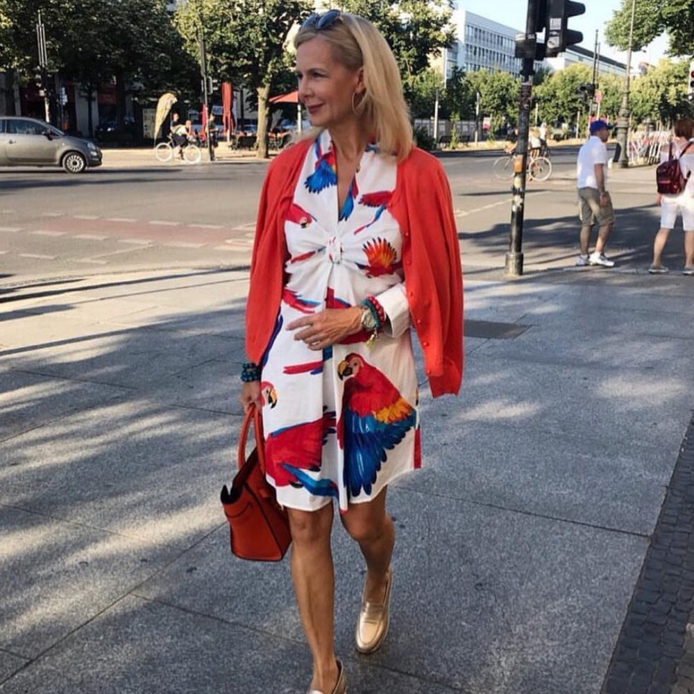 I could only find a shot of someone wearing the parrot print of this dress.