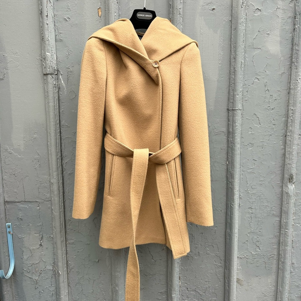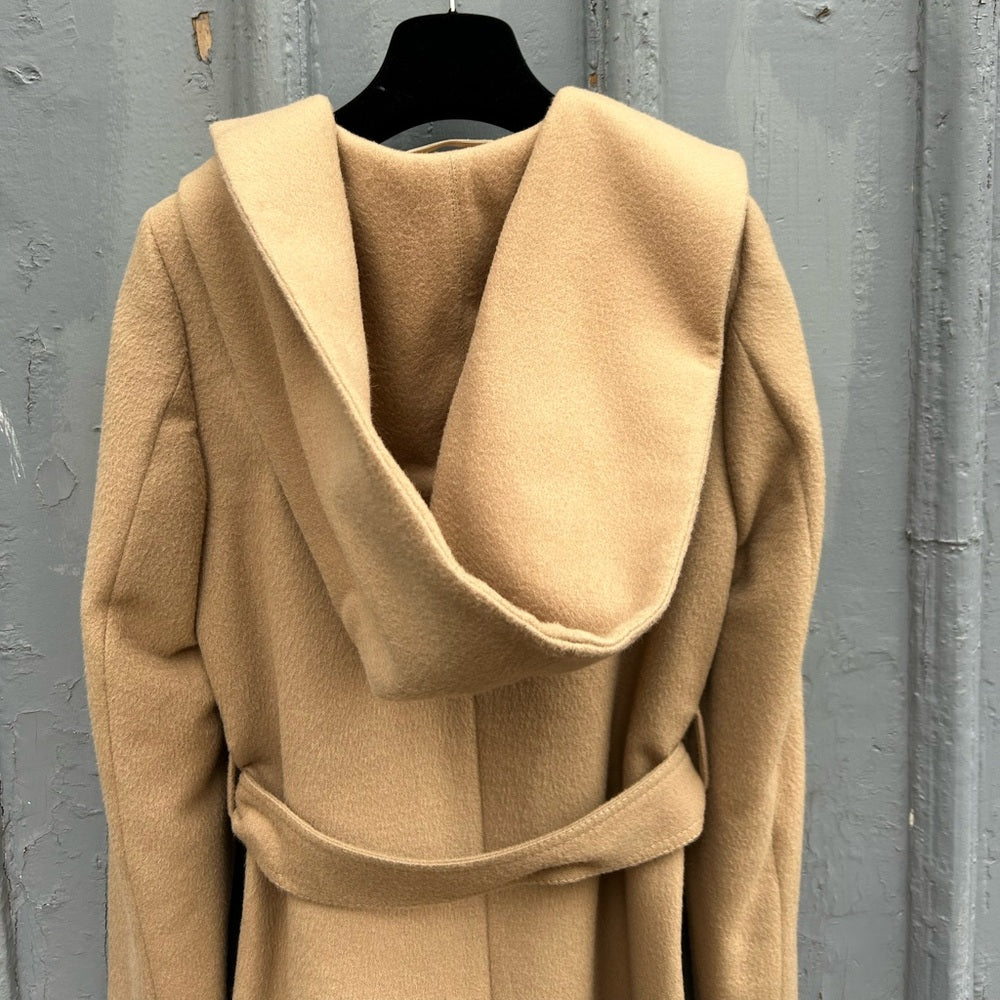 Stunning camel coloured baby Aloaca & Merino Wool wrap coat from Canadian designer Bojana Sentaler. Stunningly beautiful soft textile, one button closure with belt tie, pockets and oversized hood. The Duchess of Sussex is a big fan of this brand, she has many of their coats.