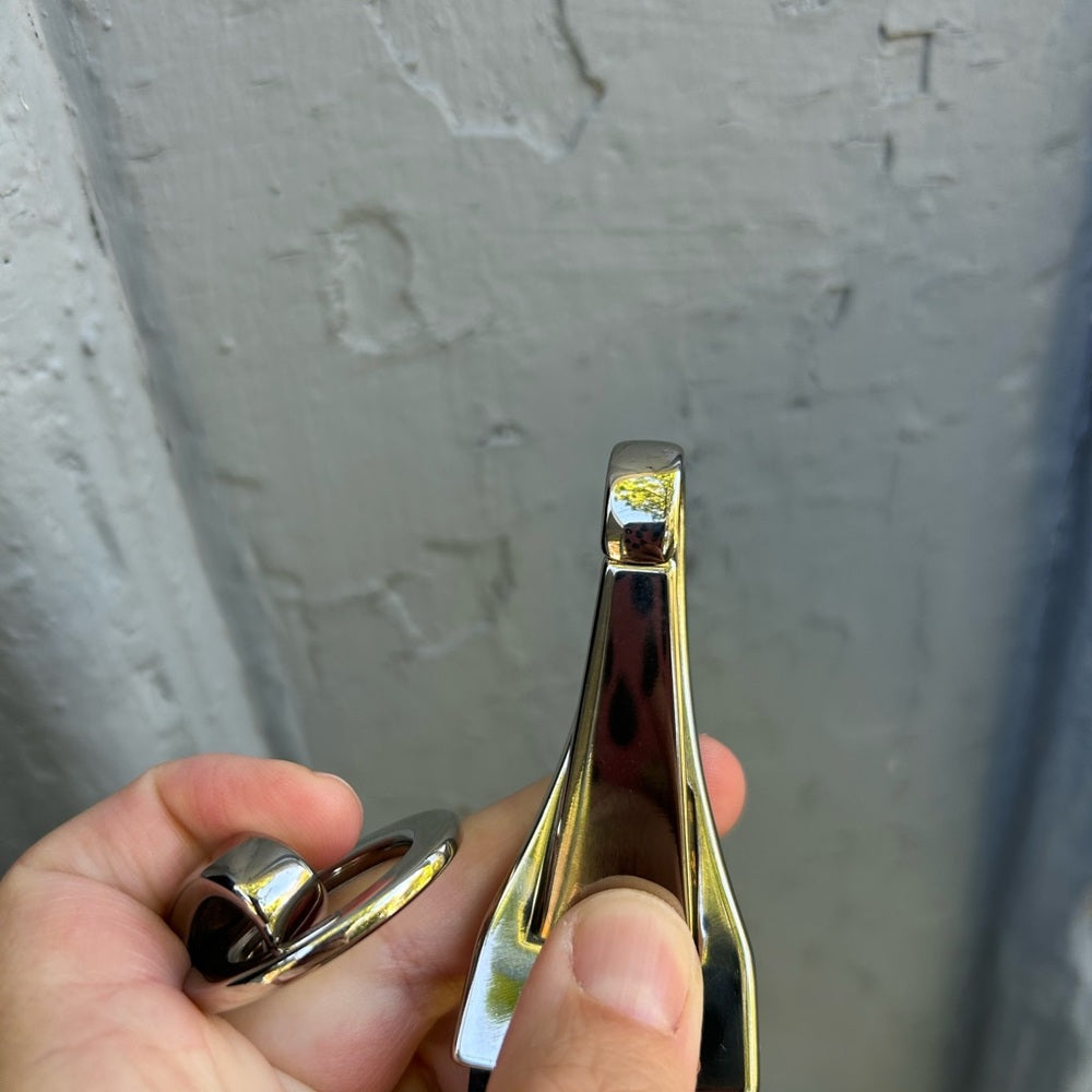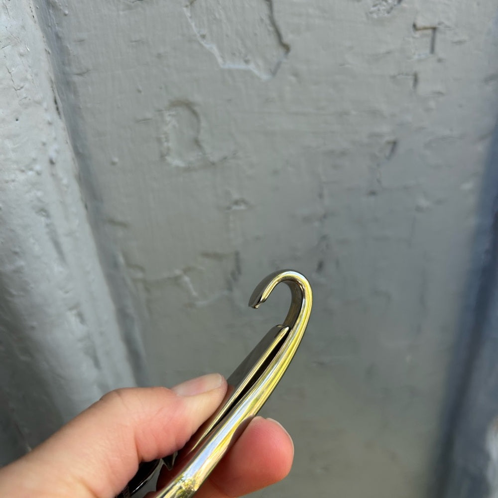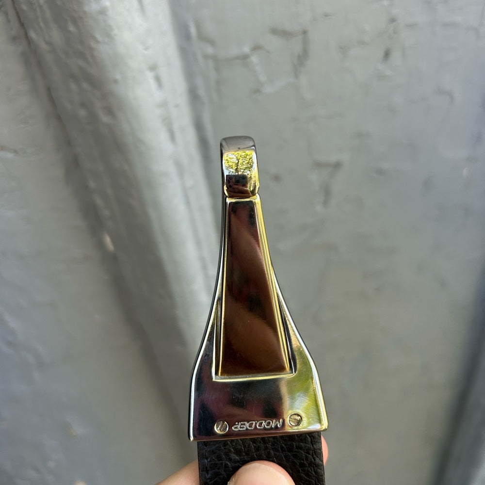 Suzi Roher black patent stretch belt. Beautiful made in Canada belt option. Patent leather with a stretch rear. Clips that clip on to a ring, both sides can clip/unclip. Belt is adjustable.