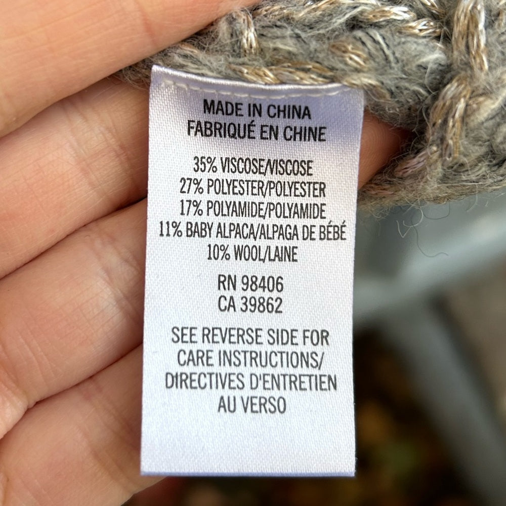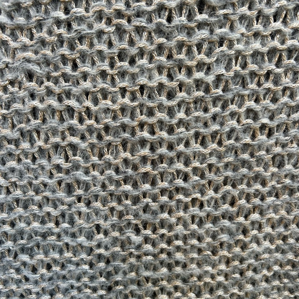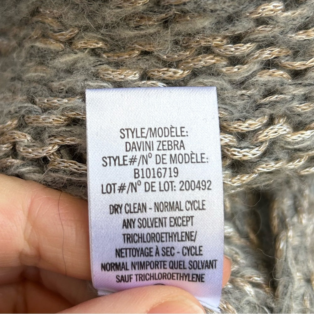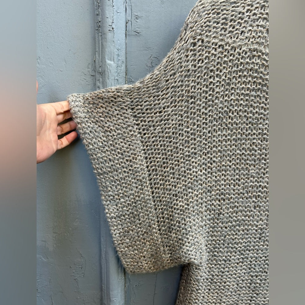 Theory Davini Zebra alpaca wool blend scoop neck kimono sleeve tunic sweater. Open knit with a marbled gray and gold colour.