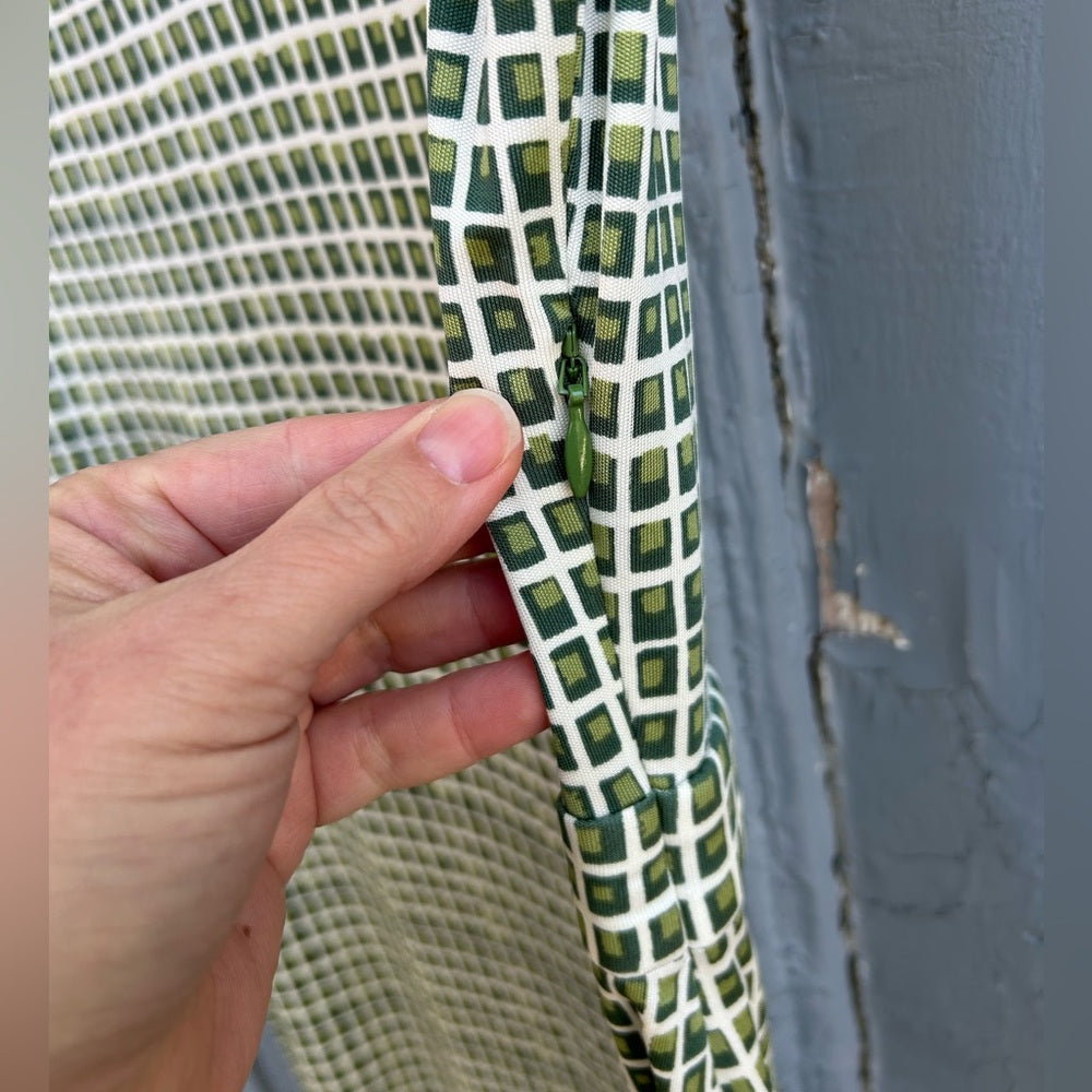 Beautiful windowpane patterned silk jersey shift dress. Fitted with a slight flare. Side zip.