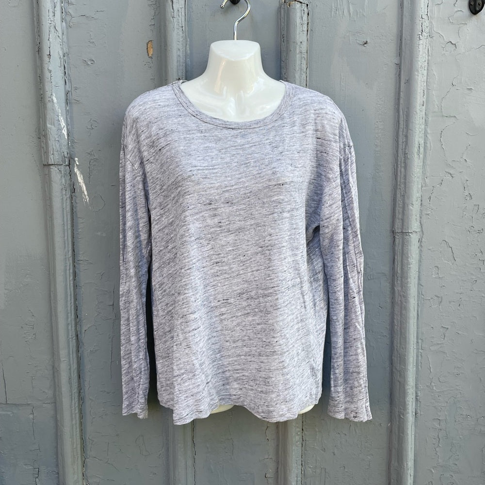 Travis Taddeo Grey Linen Long Sleeved Shirt. Slightly textured linen, crew neck, long sleeves. Perfect for summer layering against sun.