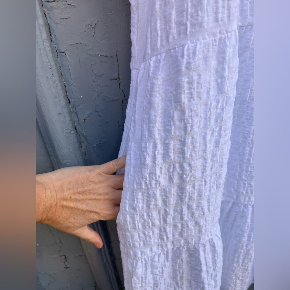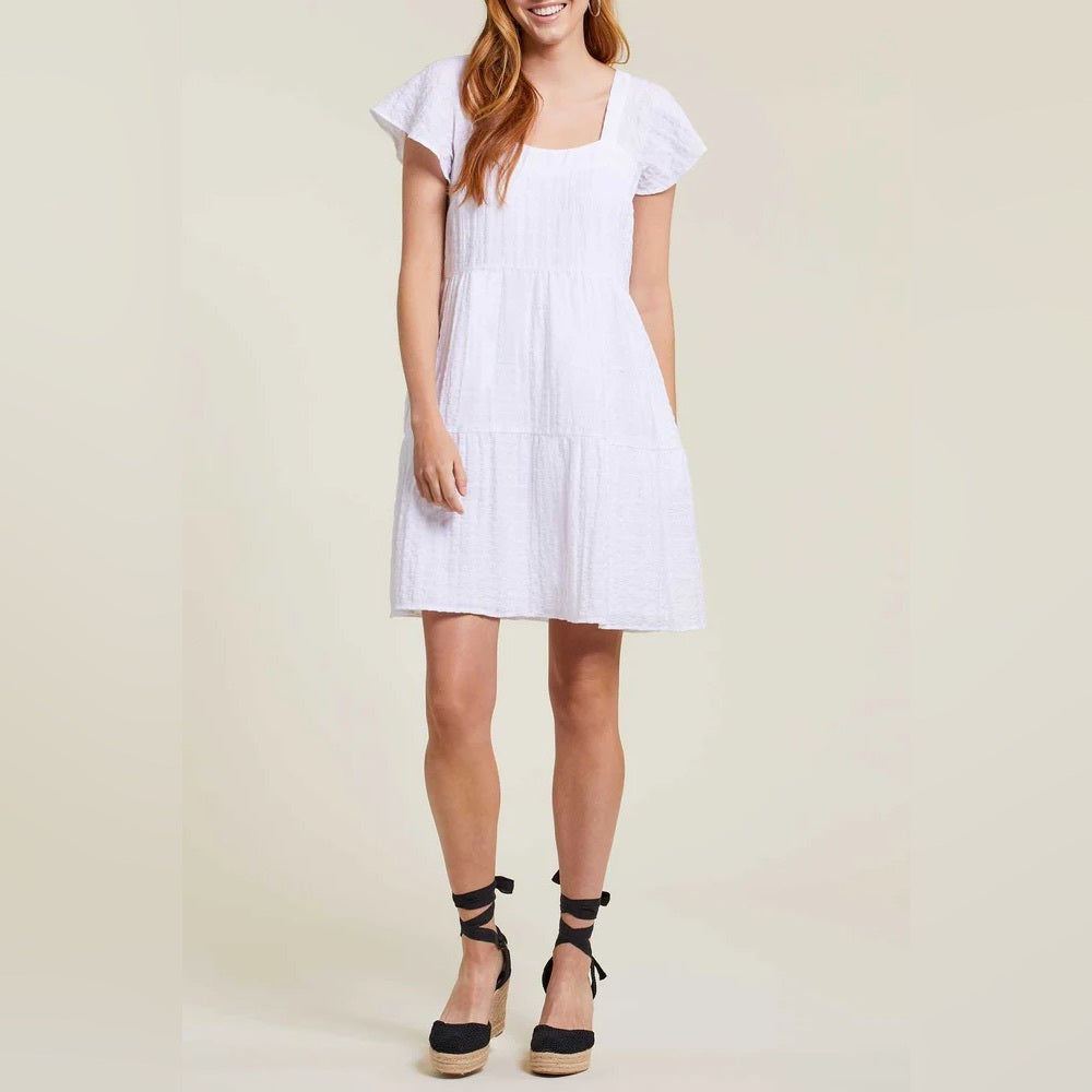 Very sweet Tribal White Shift Dress. Pretty textured seersucker style fabric, square neckline, flutter sleeves, slight A frame style.