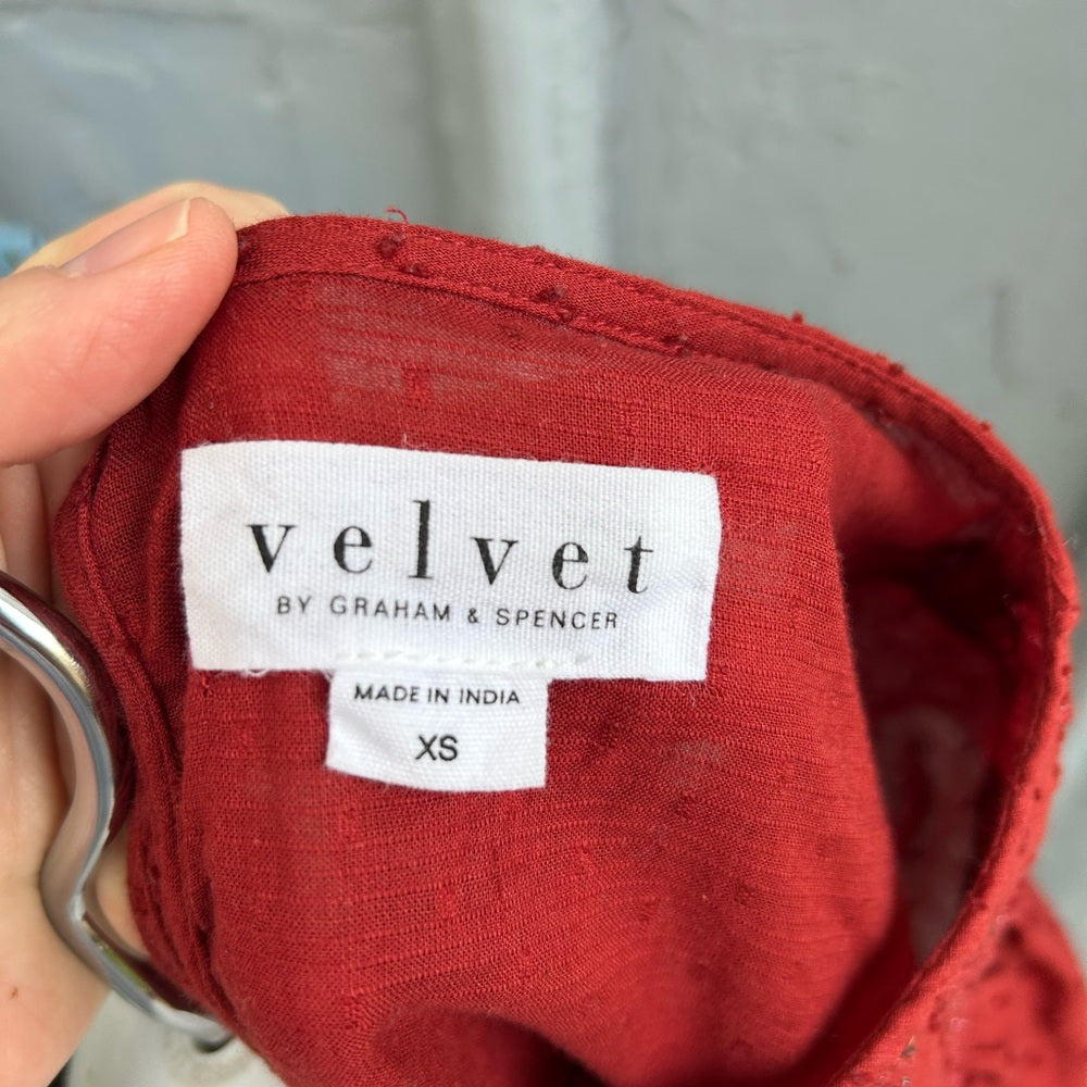 Velvet continues to provide elegant essentials; the Raina cotton shirt included. The semi-sheer design is made from "Merlot" red cotton with an embroidered dot pattern all-over and a ruffled yoke at both the front and back that's trimmed with metallic threads. Wear yours with denim shorts and espadrilles for a fail-safe summer look.