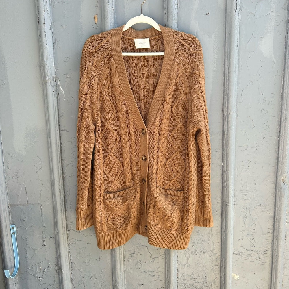 This is a button-up cardigan with raglan sleeves and welt hand pockets. It’s cable-knit with an extra-fine merino wool-cotton blend that’s lightweight and super soft against your skin.