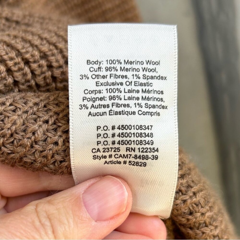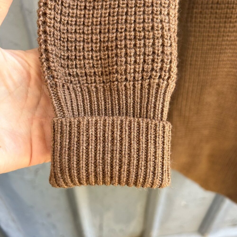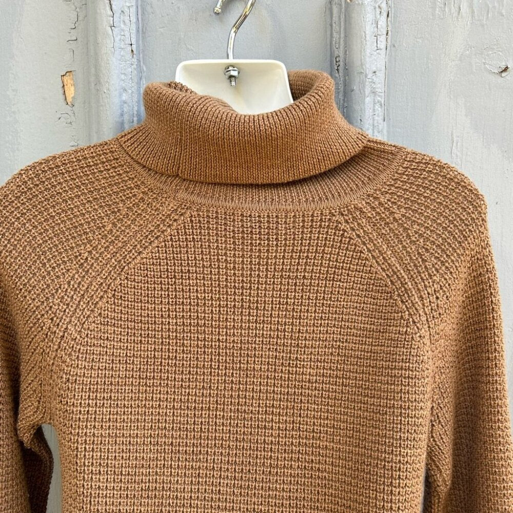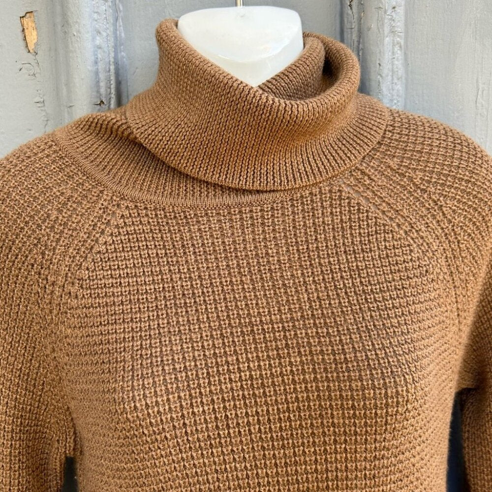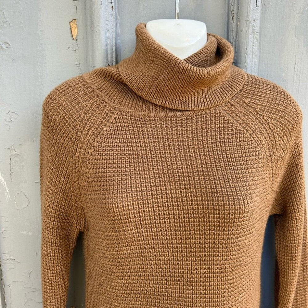 This is a sweaterdress with a fold-over turtleneck, raglan sleeves and a curved hem. It’s made from extra-fine Italian merino wool.