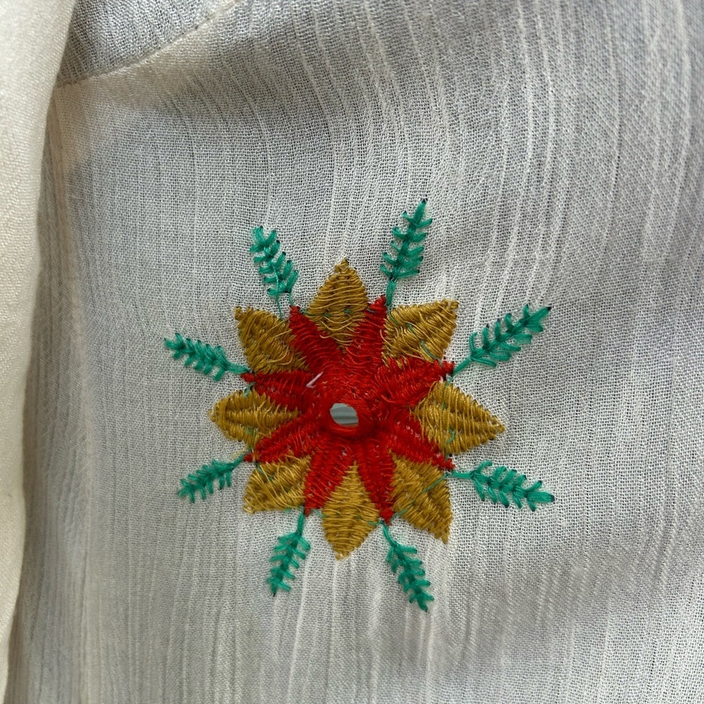 Z & L Embroidered Kimono Jacket. Beautiful boho style with embroidered design, crochet bottom. Has one hook and eye closure to allow for it to be closed or just worn open. Feels very Anthropologie style wise.